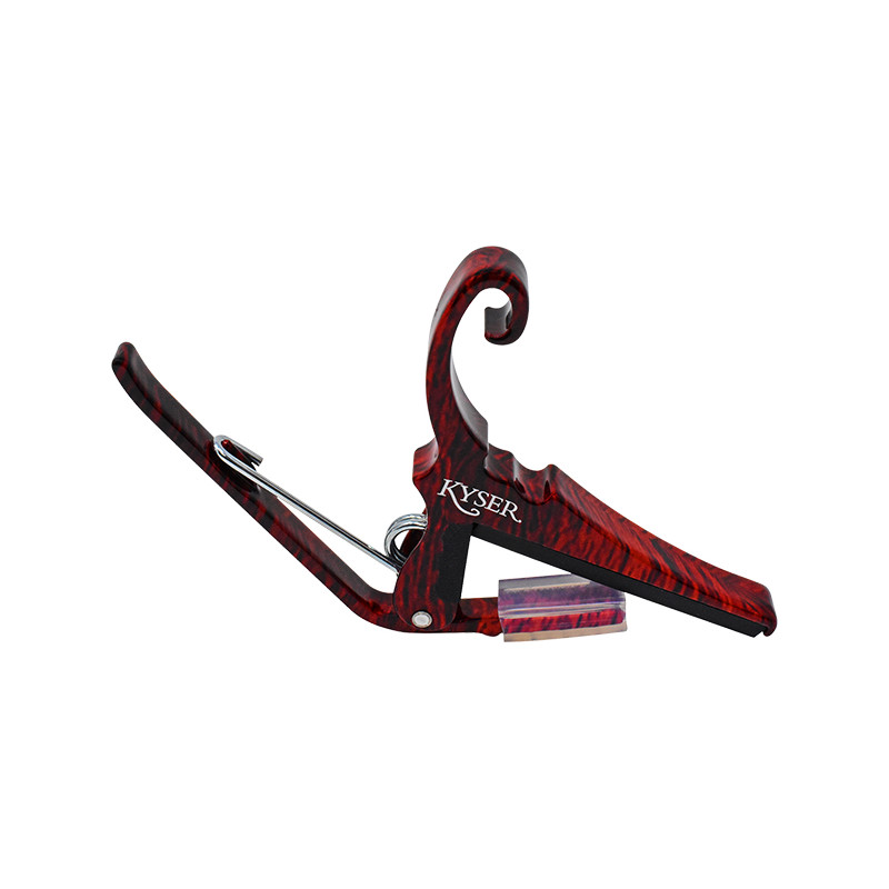 Le manche de votre guitare classique est différent de celui des guitares acoustiques ordinaires. Il a une planche de frette plate qui nécessite un capodastre sans rayon. Le Kyser Quick-Change pour guitares classiques n'a pas de rayon et est spécifiquement fabriqué avec juste la bonne quantité de tension pour les cordes classiques. Ce Kyser Quick-Change est conçu par des experts et construit pour durer. Il est fiable et fait exactement ce pour quoi il est conçu: augmenter clairement la hauteur de la guitare classique afin que vous puissiez jouer dans une tonalité différente sans réaccorder ou changer de doigté. Les professionnels chevronnés et les joueurs débutants apprécient la façon dont le Kyser Quick-Change les aide à transposer leur guitare classique en quelques secondes, d'une seule main. La beauté du Kyser Quick-Change réside dans sa simplicité. Nous avons été les pionniers de ce design et bien que souvent imité, un Kyser n'est jamais égalé. Il n'y a pas de substitut à un Kyser Quick-Change.