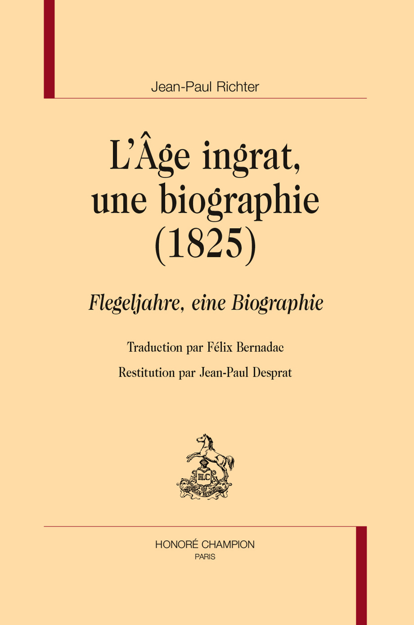 Jean-Paul Richter (1763-1825) a marqué fortement de son empreinte le romantisme allemand. En 2025, en Allemagne, il continue d’être appelé Jean-Paul, tout comme les Français, jusqu’au milieu du XIXe siècle, disaient familièrement Jean-Jacques, en évoquant Rousseau. Ses poèmes ont impressionné des générations d’artistes, Robert Schumann lui a pris ses Papillons et Gustav Malher son poème Titan. Ses romans oniriques, teintés de merveilleux et parfois « d’un style à la hardiesse bizarre » ainsi que le dit Mme de Staël, continuent d’être lus et étudiés en Allemagne. Flegeljahre, réédité récemment en livre de poche outre-Rhin et traduit en anglais en 1845 sous le titre de Walt and Vult, n’a jusqu’ici jamais été publié en français. Les éditions allemandes postérieures à 1860 ont ajouté en sous-titre « une biographie » pour souligner que le roman emprunte beaucoup d’éléments à la propre vie de Jean-Paul. Il se dépeint dans le personnage de Walt et Vult, le flutiste qui revient d’une longue absence et qui paraît sortir d’un songe, évoque le frère dont le suicide tout du long de sa vie a tourmenté Jean-Paul. Ce texte – ainsi que toute l’œuvre de Jean-Paul –, a été traduit par le colonel Félix Bernadac, (1828-1904) qui, issu d’une famille d’armateurs marseillais, après avoir accompli ses humanités à Fribourg, devait participer à la Guerre de Crimée puis enseigner à l’École de Guerre. Épris de culture germanique, il était aussi un remarquable aquarelliste et pianiste. Jean-Paul Desprat qui a repris et mis au point le manuscrit de cette traduction est l’auteur de biographies historiques : Mirabeau, Madame de Maintenon, le cardinal de Bernis ; Henri IV, les Bâtards d’Henri IV ; ainsi que de romans historiques.