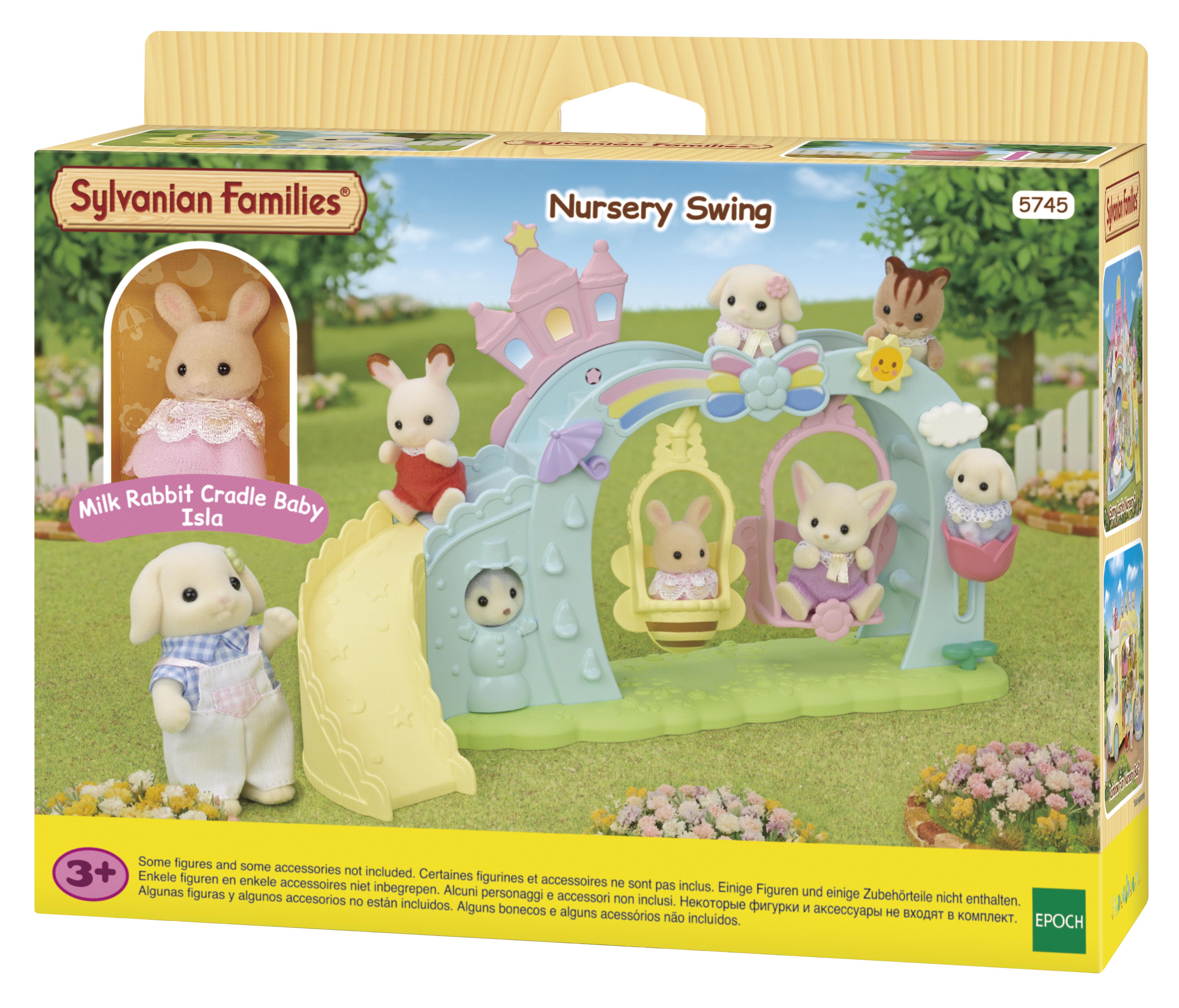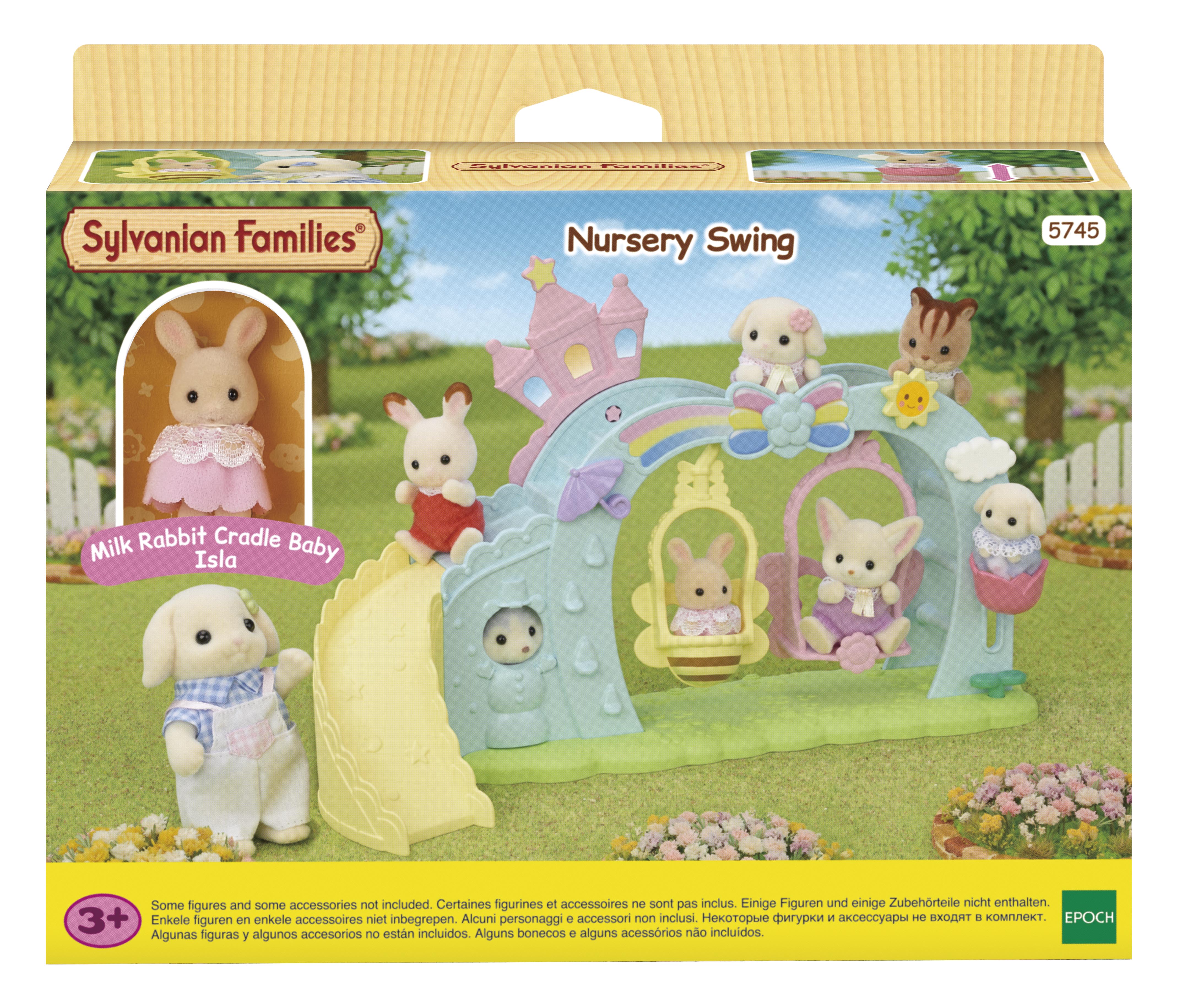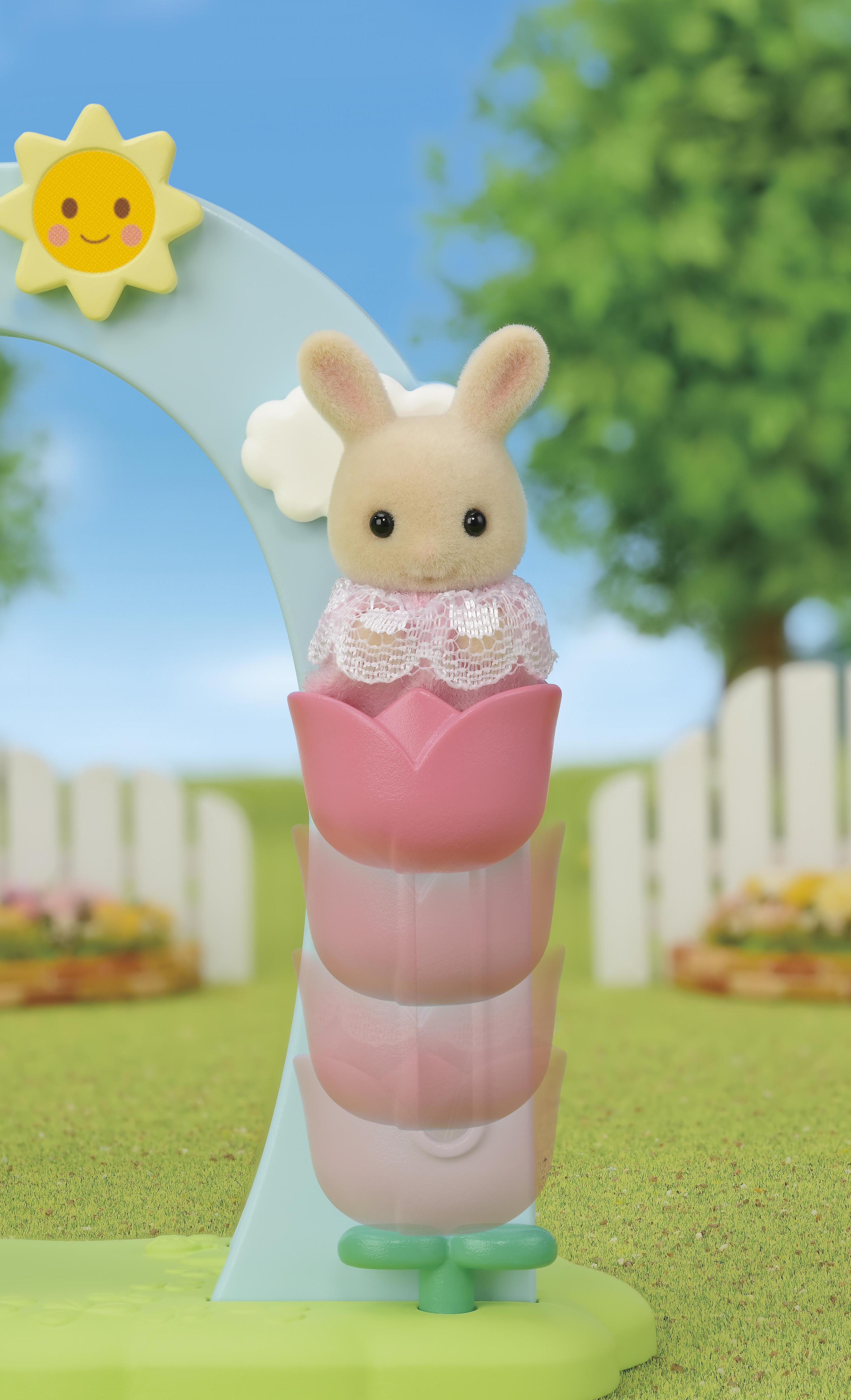 L'aire de jeu des bébés possède plusieurs jeux pour s'amuser ensemble : des balançoires papillon et abeille, un toboggan et un ascenceur en forme de tulipe. Les bébés peuvent même se cacher et se transformer un bonhomme de neige. Ce coffret contient le bébé Lapin Crème.