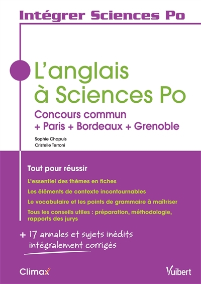 Les neuf chapitres thématiques contiennent tous une mise en contexte des notions, des sujets types intégralement corrigés, une liste exhaustive de vocabulaire et des points de grammaire en situation. Pour parfaire la préparation, l'ouvrage comporte une présentation détaillée des épreuves (spécificités de chaque concours, recommandations des jurys et conseils des correcteurs), une méthodologie pas à pas ainsi que des fiches ressources.
