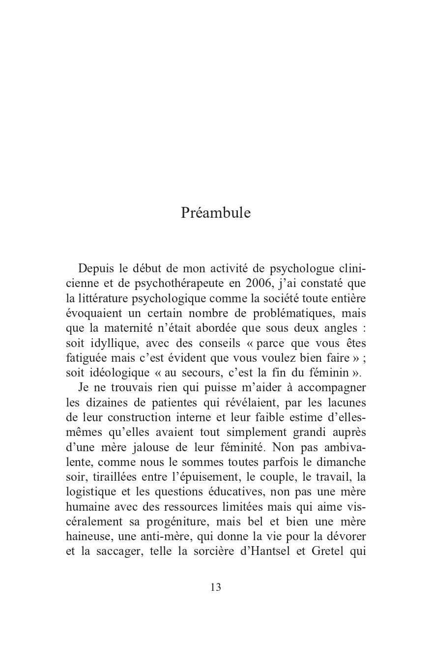Ce n'est pas un livre contre, mais un livre pour : pour aider les femmes à ne plus être des victimes, à survivre à la jalousie, à se libérer de la culpabilité et devenir pleinement mère pour leurs enfants, sans suivre le modèle de l'anti-mère.
