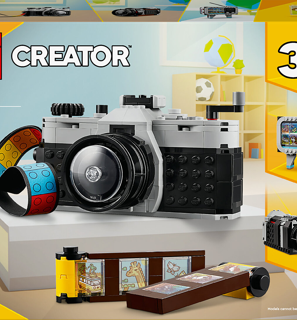 L'appareil photo rétro LEGO Creator (31147) est un ensemble 3-en-1 avec lequel les garçons et les filles de 8 ans et plus peuvent construire 3 modèles créatifs. Votre enfant peut d'abord construire un appareil photo jouet, puis le transformer soit en une caméra vidéo rétro, soit en un téléviseur rétro avec une antenne. Ce jouet LEGO Creator 3-en-1 rétro offre aux enfants 3 expériences de construction et de jeu différentes avec les mêmes briques. L'appareil photo LEGO a un objectif mobile, des boutons de commande sur le dessus, un panneau arrière ouvrant pour insérer un film en briques LEGO, ainsi qu'une sangle en tissu. Six autocollants représentent les photos de votre enfant. Les 3 modèles conviennent parfaitement comme décoration de bureau rétro. Notre large sélection de jouets LEGO 3-en-1 pour les filles et les garçons attire les enfants aux intérêts variés et comprend, entre autres, des véhicules rapides, des animaux fascinants et des scènes de ville détaillées. L'appareil photo rétro LEGO Creator est un cadeau créatif pour les petits photographes passionnés de photos et de vidéos.