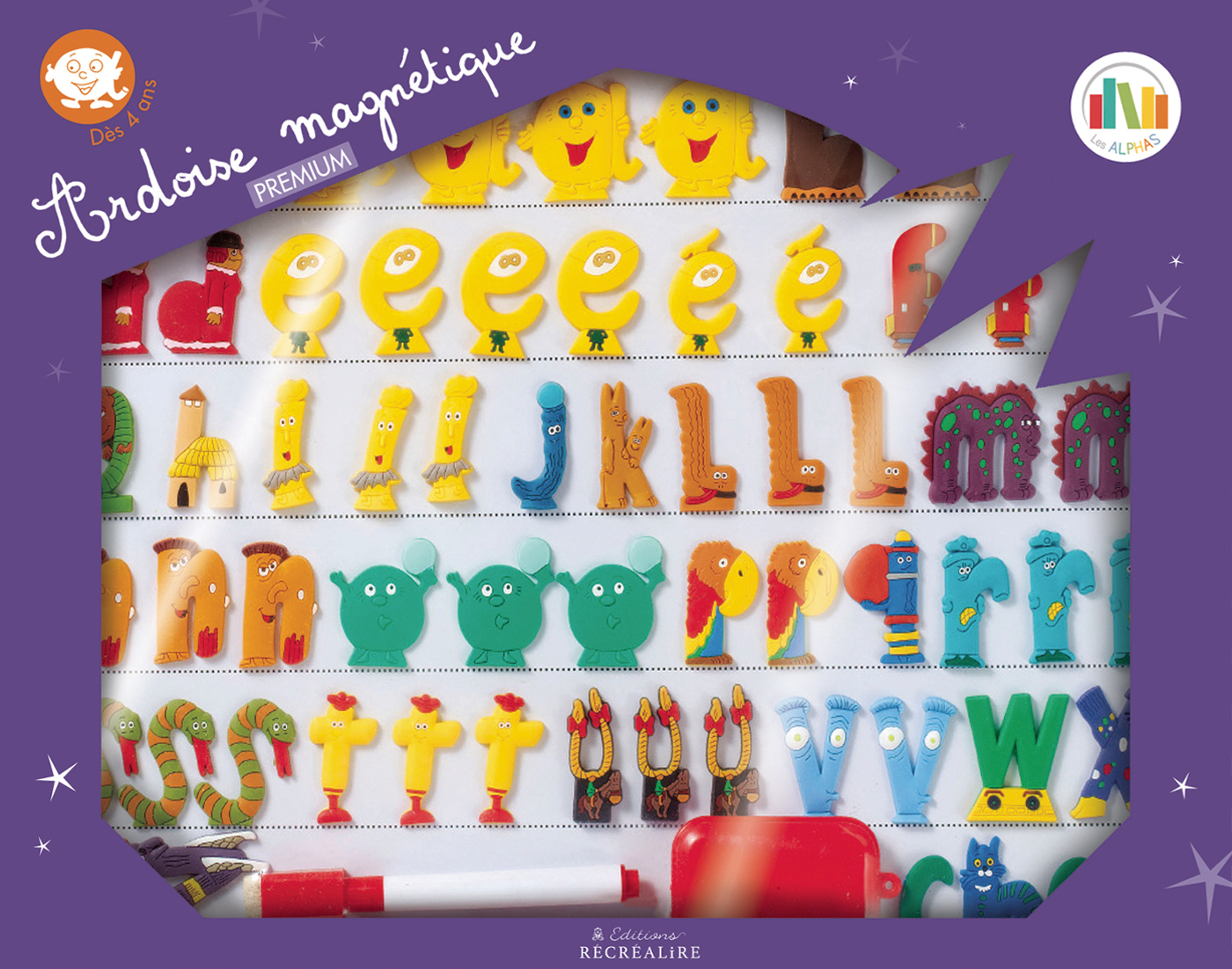 Cette ardoise magnétique premium double-face et effaçable est constituée de 60 Alphas magnétiques avec aimants intégrés sous un format souple (les 28 personnages des Alphas ainsi que les personnages les plus souvent utilisés en plusieurs exemplaires). Pratique d'utilisation pour la classe ou la maison, elle contient un stylo et un effaceur. Elle peut être utilisée dès l'étape 1 de la méthode de lecture Les Alphas : faire la correspondance entre les sons et les lettres, comprendre notre principe alphabétique et donner le "déclic-lecture" à l'enfant. Accompagnée d'un livret d'activités, l'ardoise version premium permet d'effectuer différentes activités pour comprendre le principe alphabétique, reconnaître les Alphas, développer la manipulation, et écrire des mots à la fois avec le stylo et les Alphas magnétiques.