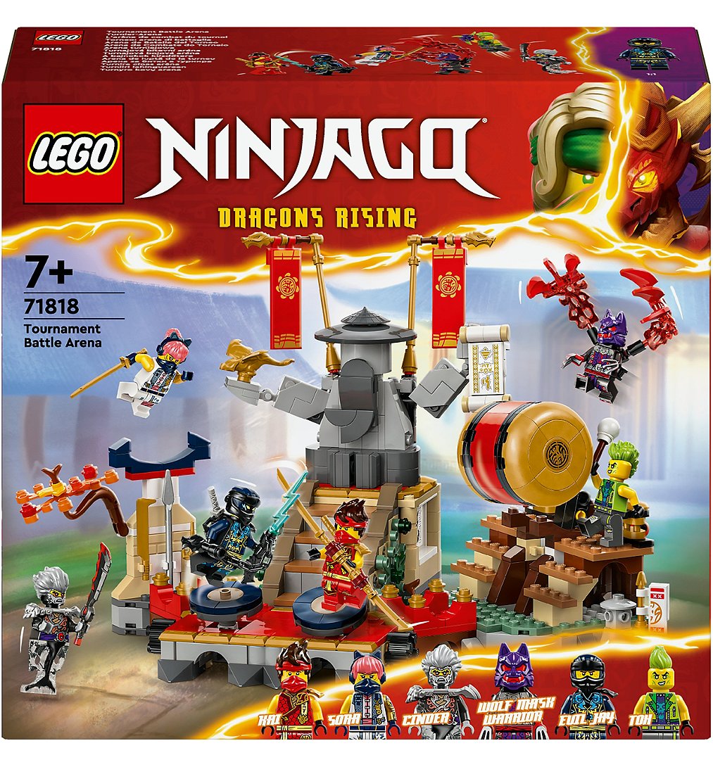Cette arène de combat du tournoi (71818) détaillée invite les enfants garçons et les filles dès 7 ans à recréer l’affrontement final spectaculaire de la saison 2 de la série télévisée NINJAGO Le soulèvement des dragons. Le set inclut de nombreuses fonctionnalités interactives pour offrir des heures de jeu aux enfants. Exposé sur une étagère ou une table de chevet, ce jouet dragon ninja attirera tous les regards. Ce set LEGO NINJAGO inclut 2 plateformes mobiles qui permettent aux enfants de rejouer des combats haletants avec un ninja et un méchant, un grand baril à pousser dans l’arène et un escalier qui s’effondre à l’aide d’un levier pour faire tomber tous les personnages. Ce jouet ninja à construire qui inclut 6 minifigurines NINJAGO est une excellente idée cadeau d'anniversaire. Les ninjas Kai et Sora, vêtus de leurs armures de tournoi et équipés de petits katanas (une exclusivité de ce set), affrontent de nombreux méchants : Cinder, un Guerrier au masque de loup ainsi que, en exclusivité pour ce set, Jay maléfique et Tox.