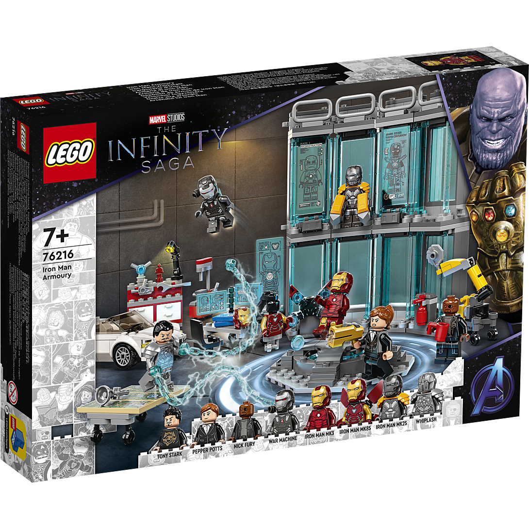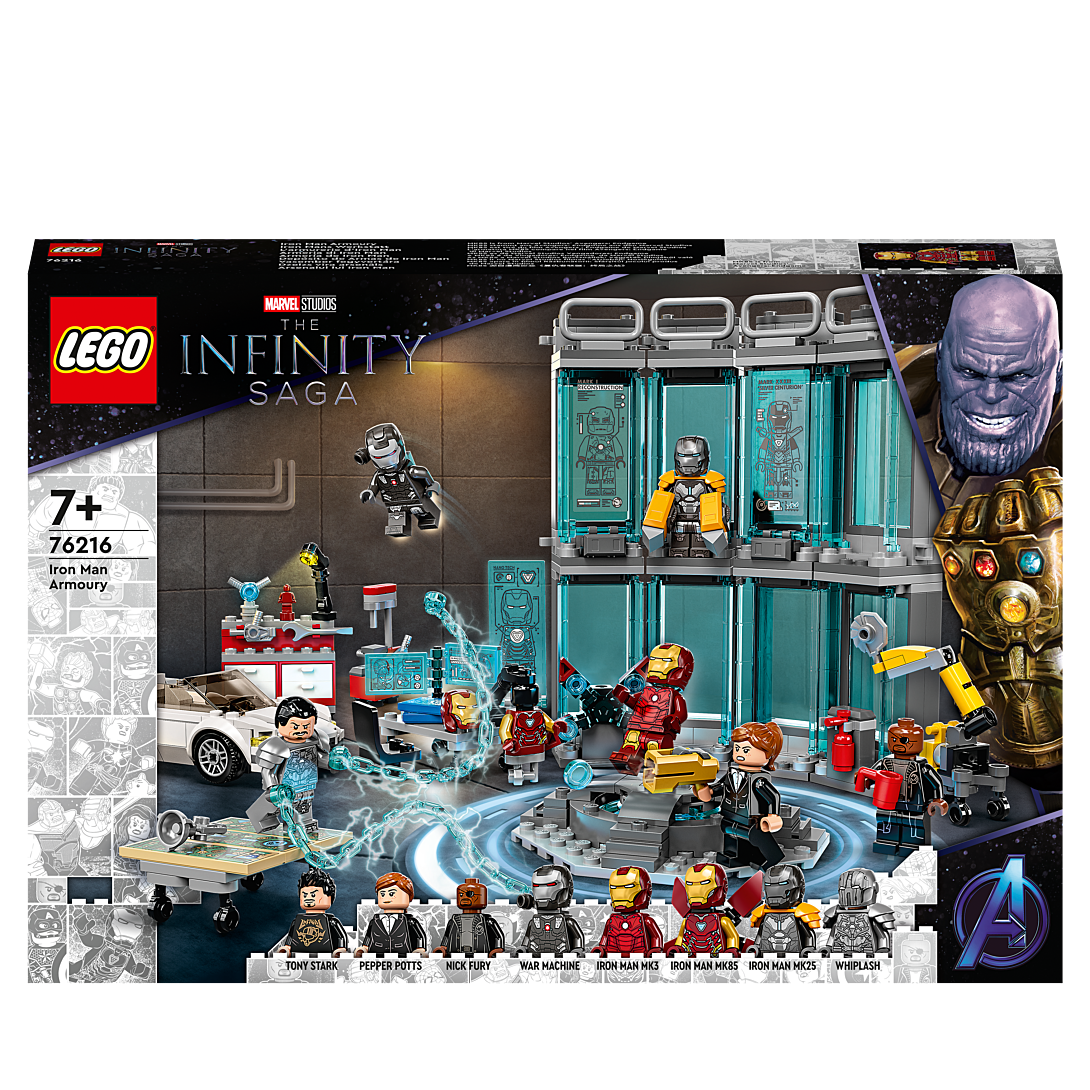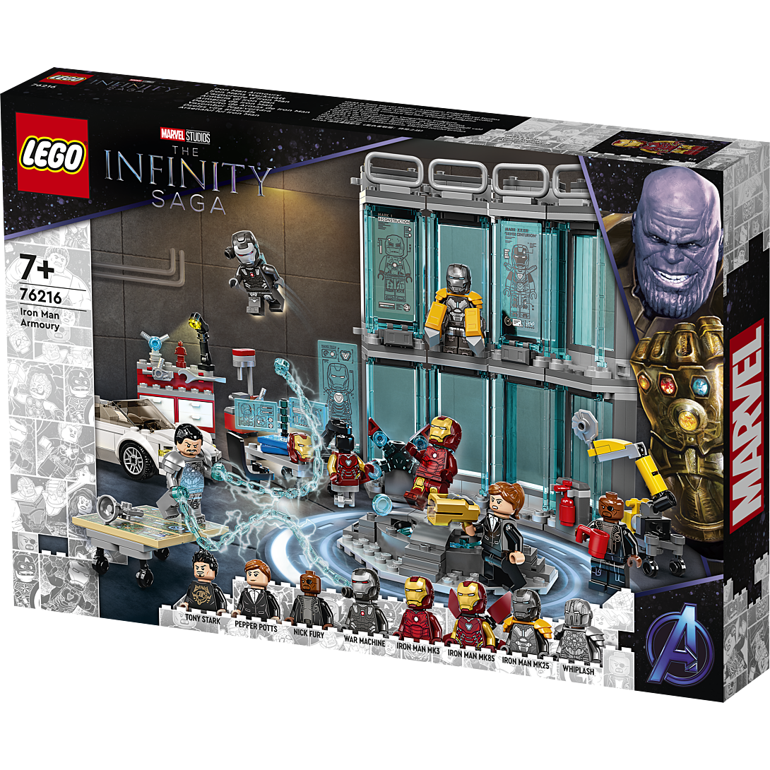 L’armurerie d’Iron Man LEGO® Marvel (76216) regorge de détails authentiques, de fonctionnalités fascinantes et de minifigurines mythiques qui raviront tous les fans des films La saga de l’infini de Marvel Studios. Un set détaillé pour les fans d’Iron Man dès 7 ans Ce set riche en fonctionnalités transporte les enfants dans la pièce mythique où Iron Man range ses armures high-tech. Outre les armures MK3, MK25 et MK85 d’Iron Man, le set inclut un atelier avec des outils pour effectuer les réparations, ainsi qu’une plateforme sur laquelle le super-héros milliardaire peut s’équiper de l’armure de son choix. Le set inclut également 3 écrans holographiques, une voiture de sport, un bras robotisé, de nombreux accessoires et huit minifigurines dont Tony Stark, Pepper Potts, Nick Fury, War Machine et Whiplash. L’appli gratuite Instructions de montage LEGO permet aux enfants de visualiser, zoomer et faire pivoter le modèle pendant la construction, pour un incroyable sentiment d’immersion et d’interaction.