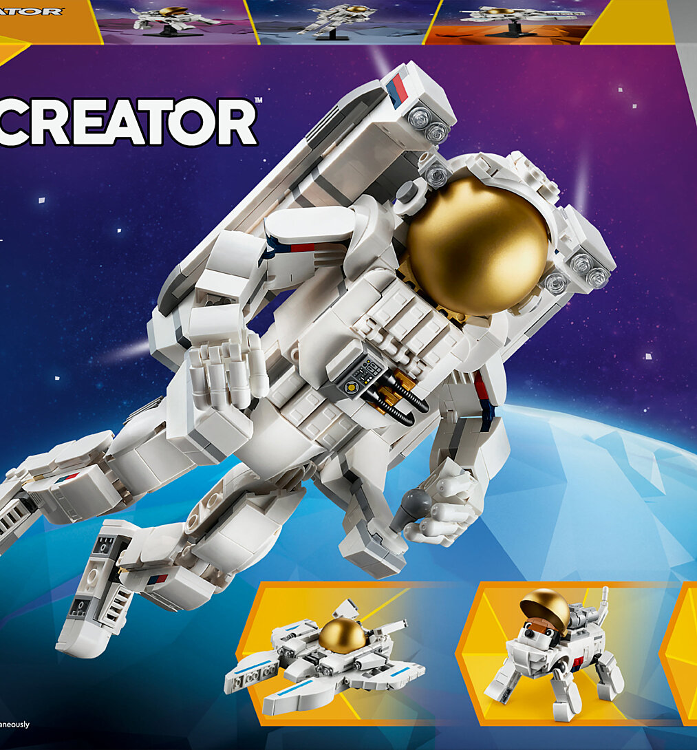 Les fans de LEGO de 9 ans et plus vont pouvoir voler dans l'espace et explorer de nouvelles planètes avec cet ensemble de construction. Le jouet LEGO Creator Astronaute dans l'espace (31152) porte un sac à dos de fusée amovible et un casque avec une visière dorée. Ses jambes, ses pieds, ses bras et ses doigts peuvent être déplacés. Les garçons et les filles peuvent construire 3 modèles différents avec ce jouet LEGO spatial. La figurine d'astronaute mobile peut également être transformée en un chien spatial futuriste aux pattes et à la queue mobiles. Ou vous pouvez construire le modèle en un jet spatial Viper avec un siège pour une figurine non incluse. Un support pour l'exposer en tant que décoration pour une chambre d'enfant est inclus pour les 3 modèles. Attendez-vous à un ensemble vraiment créatif de la thématique de l'exploration spatiale. Les jouets LEGO Creator 3-en-1 sont des cadeaux créatifs pour les enfants de 9 ans. Avec les briques incluses dans chaque boîte, votre enfant peut construire 3 modèles différents et les transformer à l'infini. Les ensembles 3-en-1 offrent aux enfants aux intérêts variés des heures de plaisir de jeu avec une large sélection de jouets super sympa. Cela inclut des véhicules rapides, des animaux fascinants et des scènes de ville détaillées.