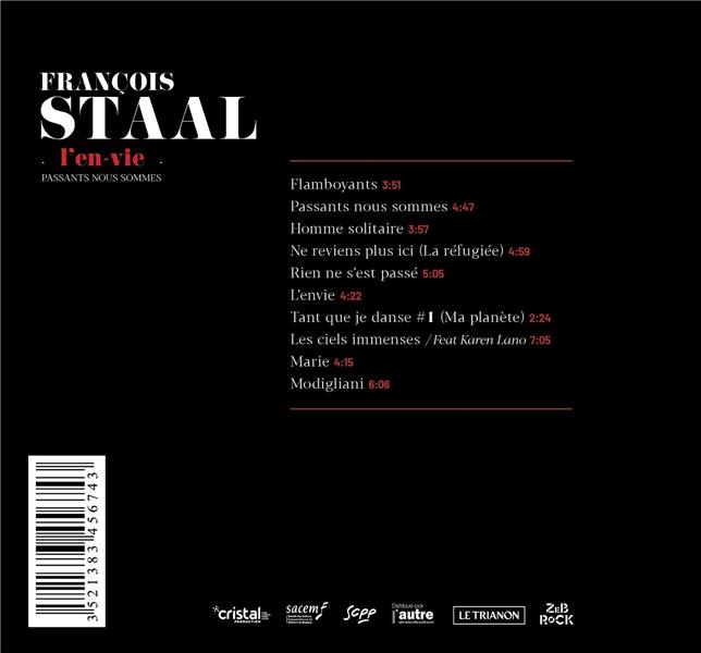 LE POÈTE ROCK RARE ET INTENSE (Midi Libre) Certaines intonations me font penser aux approches de Cohen, de Rodolph Burger, Miossec, ou plutôt Bashung. Le son est abouti. C'est cohérent. Vraiment c'est bien. \" CHARLELIE COUTURE Pour son 6ème album François Staal revient dans ce temple de la chanson Rock. L'en-vie, enregistré en immersion au Manoir de Léon dégage un rock résistance, émotion, colère, mots d'amour et de désespoir mais néanmoins en osmose avec un infini optimisme. Pour témoigner de notre époque et de ses défis, l'en-vie de musique et de rock, la mise en-vie des \" différents \" et des oubliés, avec une certaine élégance dans tout, voilà la recherche de cet artiste hors systèmes. 4 musiciens sur scène qui envoient un souffle de chansons rock dans une lumière noire qui hypnotise. François Staal nous invite, nous transporte vers son univers unique: les rives d'un rock poétique.\" Le Figaro.