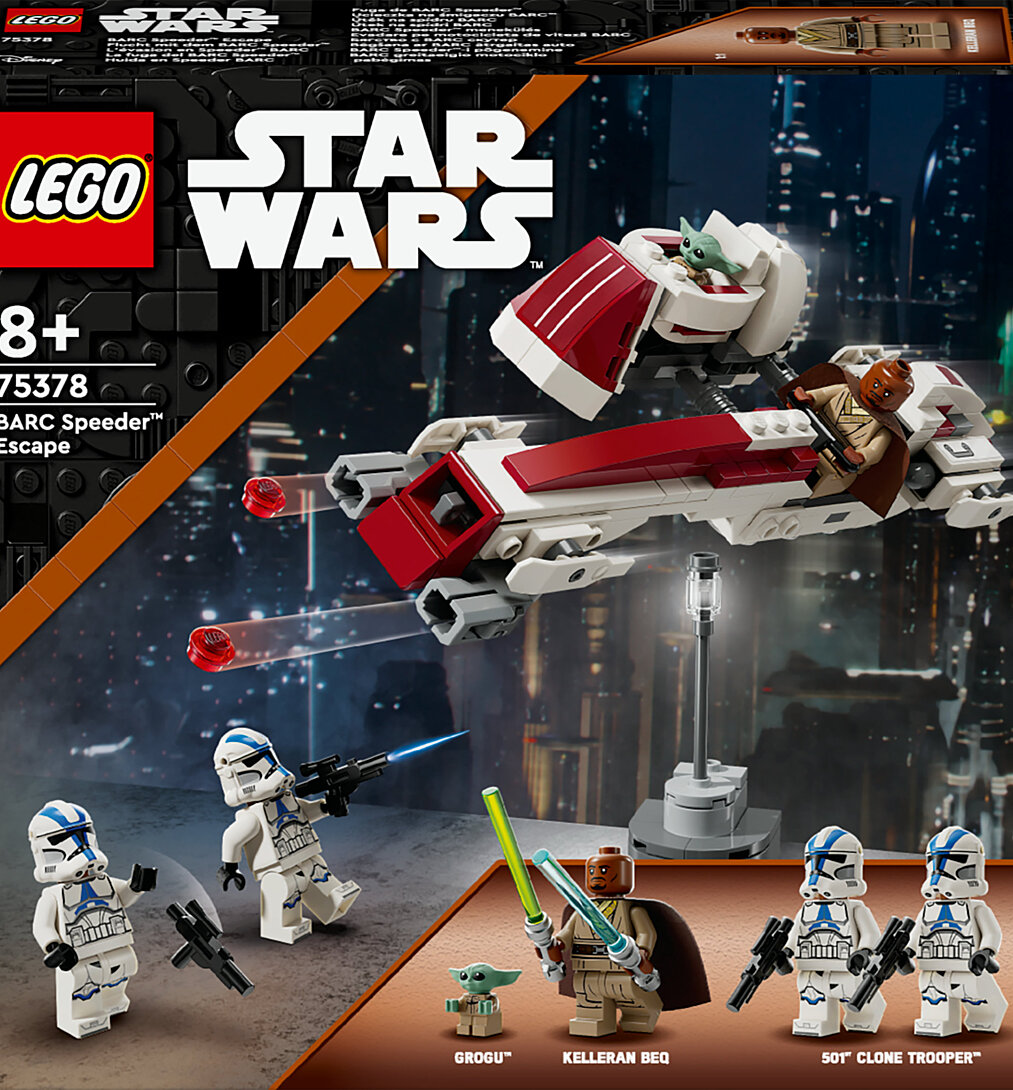 Revivez l’évasion en Speeder BARC du flashback de la saison 3 de Star Wars: The Mandalorian avec ce set LEGO Star Wars (75378) unique. Le speeder avec side-car en briques LEGO est une belle idée de cadeau pour les enfants, les fans et les collectionneurs d’objets Star Wars dès 8 ans. Il est doté d’un cockpit pour une minifigurine et de 2 fusils à tenons, et la nacelle de Grogu peut être clipsée sur le side-car détachable. Ce set de construction inclut également un petit décor et 3 minifigurines LEGO (Kelleran Beq muni de sabres laser bleu et vert et 2 Clone Troopers de la 501ème légion avec des blasters) ainsi qu’une figurine LEGO de Grogu (surnommé « Bébé Yoda » par les fans), pour un jeu débordant d’action. Ce jouet inspirant des aventures haletantes inclut des instructions étape par étape. Les enfants peuvent également télécharger l’application LEGO Builder proposant des outils de visualisation numérique zoom et rotation qui enrichissent l’expérience créative.