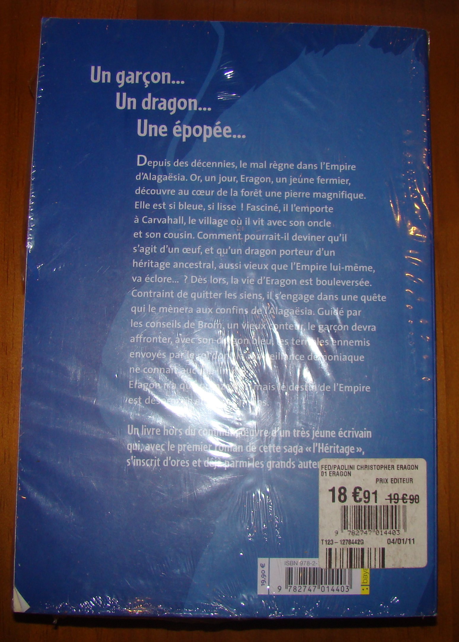 Voilà bien longtemps que le mal règne dans l'Empire de l'Alagaësia... Et puis, un jour, le jeune Eragon découvre au coeur de la forêt une magnifique pierre bleue, étrangement lisse. Fasciné et effrayé, il l'emporte à Carvahall, le village où il vit très simplement avec son oncle et son cousin. Il n'imagine pas alors qu'il s'agit d'une oeuf, et qu'un dragon, porteur d'un héritage ancestral, aussi vieux que l'Empire lui-même, va en éclore... Très vite, la vie d'Eragon est bouleversée. Contraint de quitter les siens, il s'engage dans une quête qui le mènera aux confins de l'Alagaësia. Armé de son épée et guidé par les conseils de Brom, le vieux conteur, Eragon va devoir affronter, avec son jeune dragon, les terribles ennemis envoyés par le roi dont la malveillance démoniaque ne connaît aucune limite.