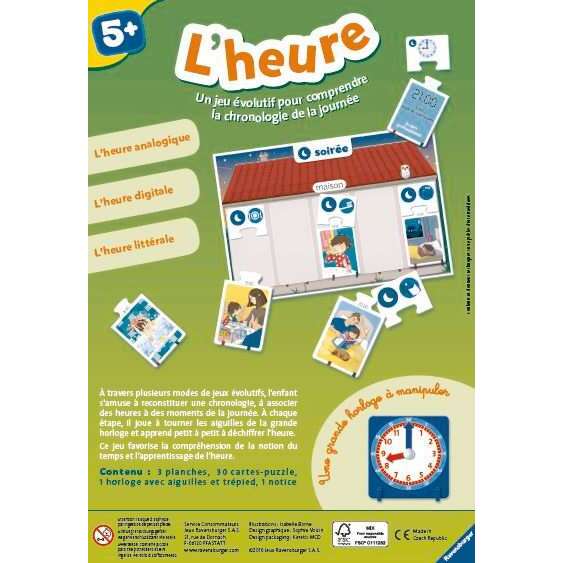 | La boîte contient | 3 planches, 30 cartes-puzzles, 1 horloge avec aiguilles et trépied, 1 notice |