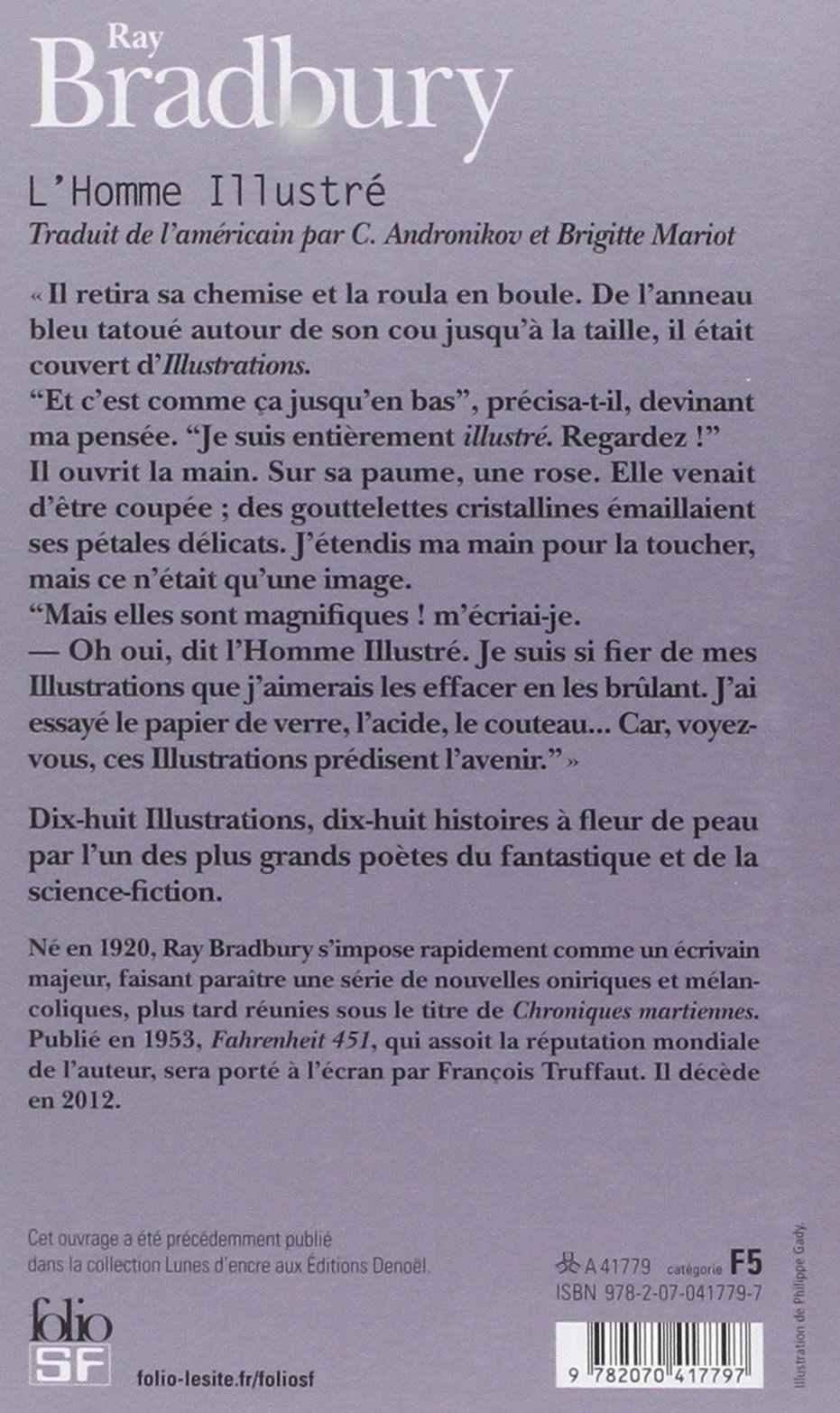 "Il retira sa chemise et la roula en boule. De l'anneau bleu tatoué autour de son cou jusqu'à la taille, il était couvert d'Illustrations. "Et c'est comme ça jusqu'en bas", précisa-t-il, devinant ma pensée. "Je suis entièrement illustré. Regardez !" Il ouvrit la main. Sur sa paume, une rose. Elle venait d'être coupée ; des gouttelettes cristallines émaillaient ses pétales délicats. J'étendis ma main pour la toucher, mais ce n'était qu'une image. "Mais elles sont magnifiques ! m'écriai-je. - Oh oui, dit l'Homme Illustré. Je suis si fier de mes Illustrations que j'aimerais les effacer en les brûlant. J'ai essayé le papier de verre, l'acide, le couteau... Car, voyez-vous, ces Illustrations prédisent l'avenir."" Dix-huit Illustrations, dix-huit histoires à fleur de peau par l'un des plus grands poètes du fantastique et de la science-fiction.