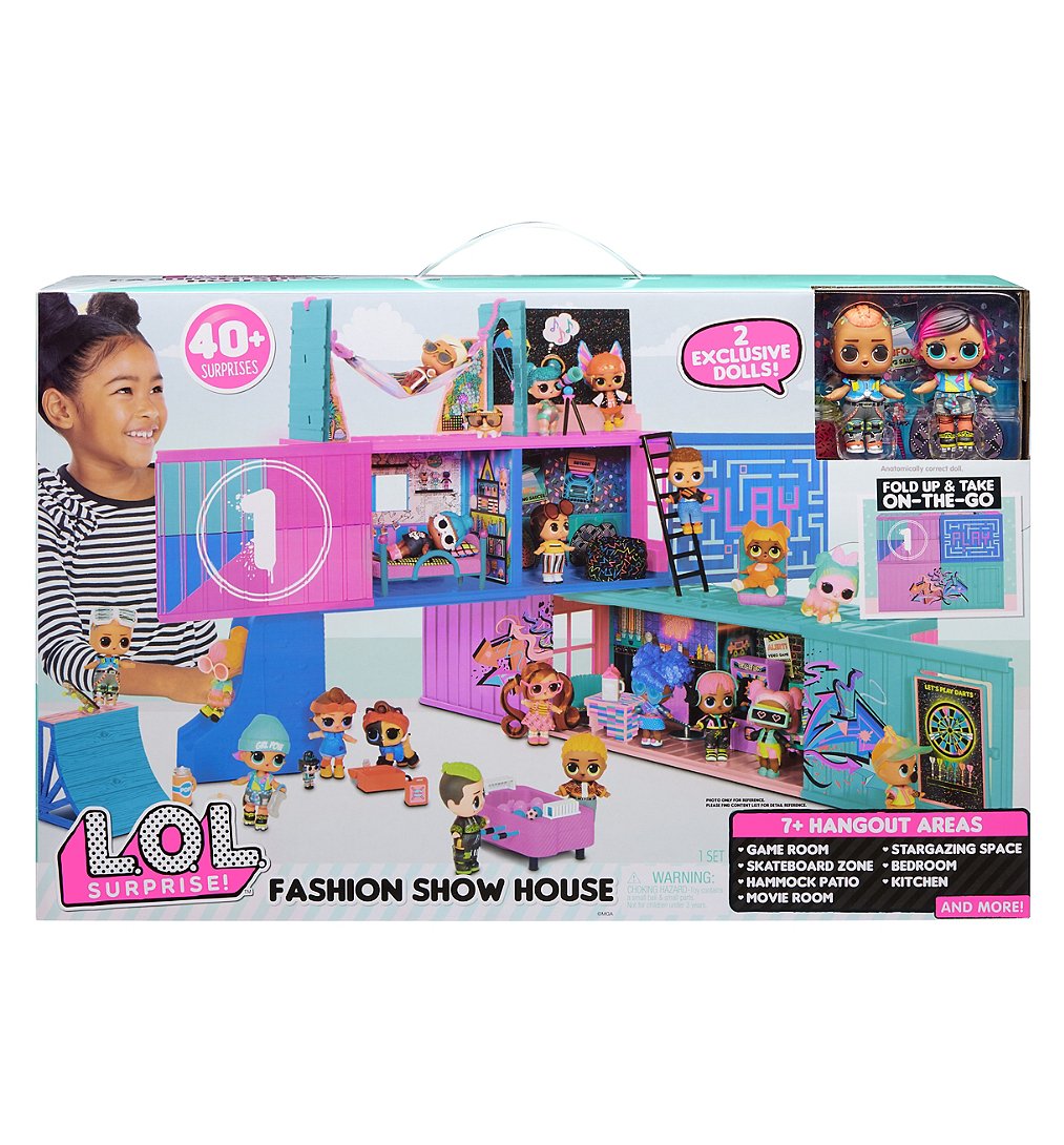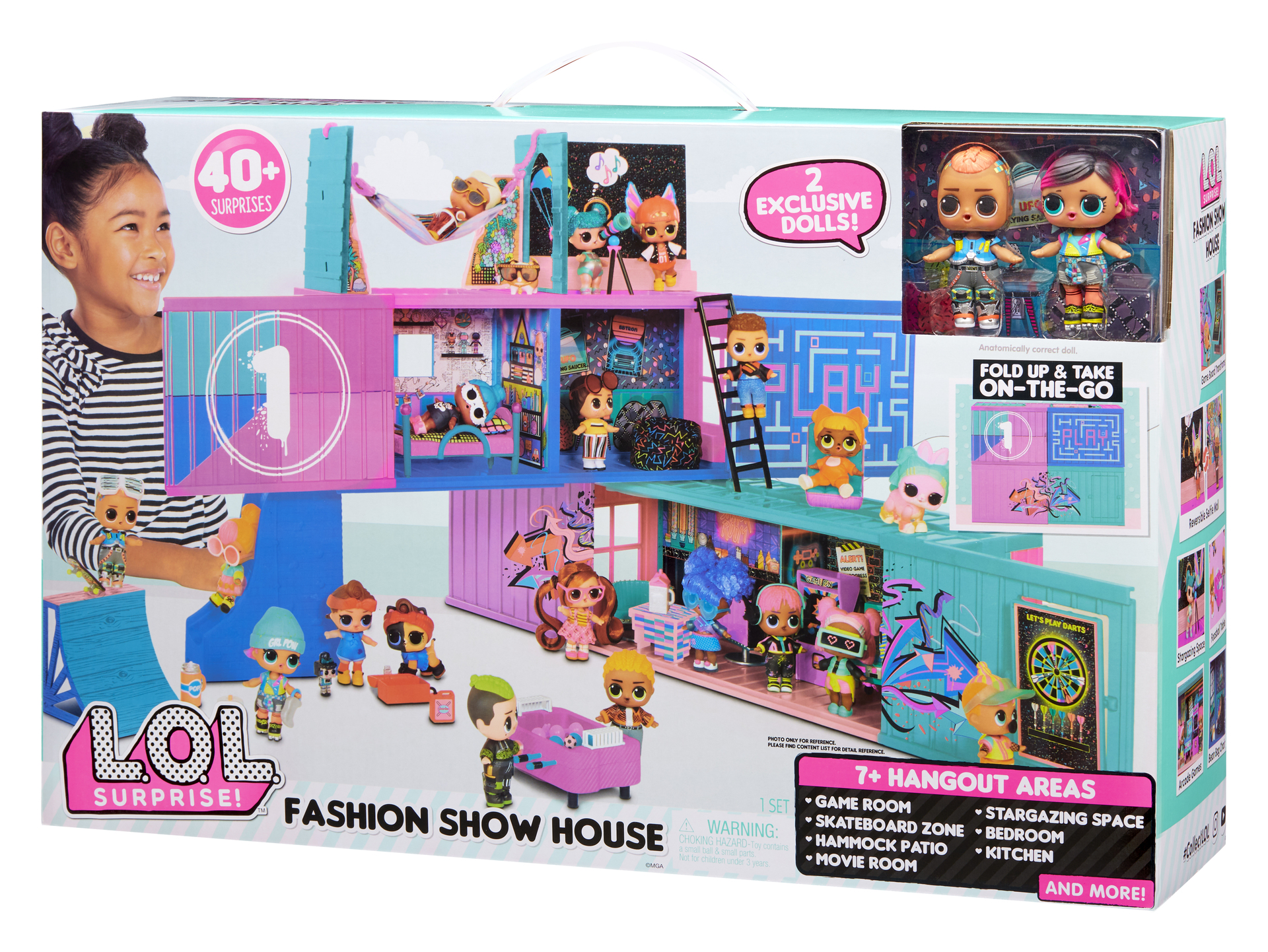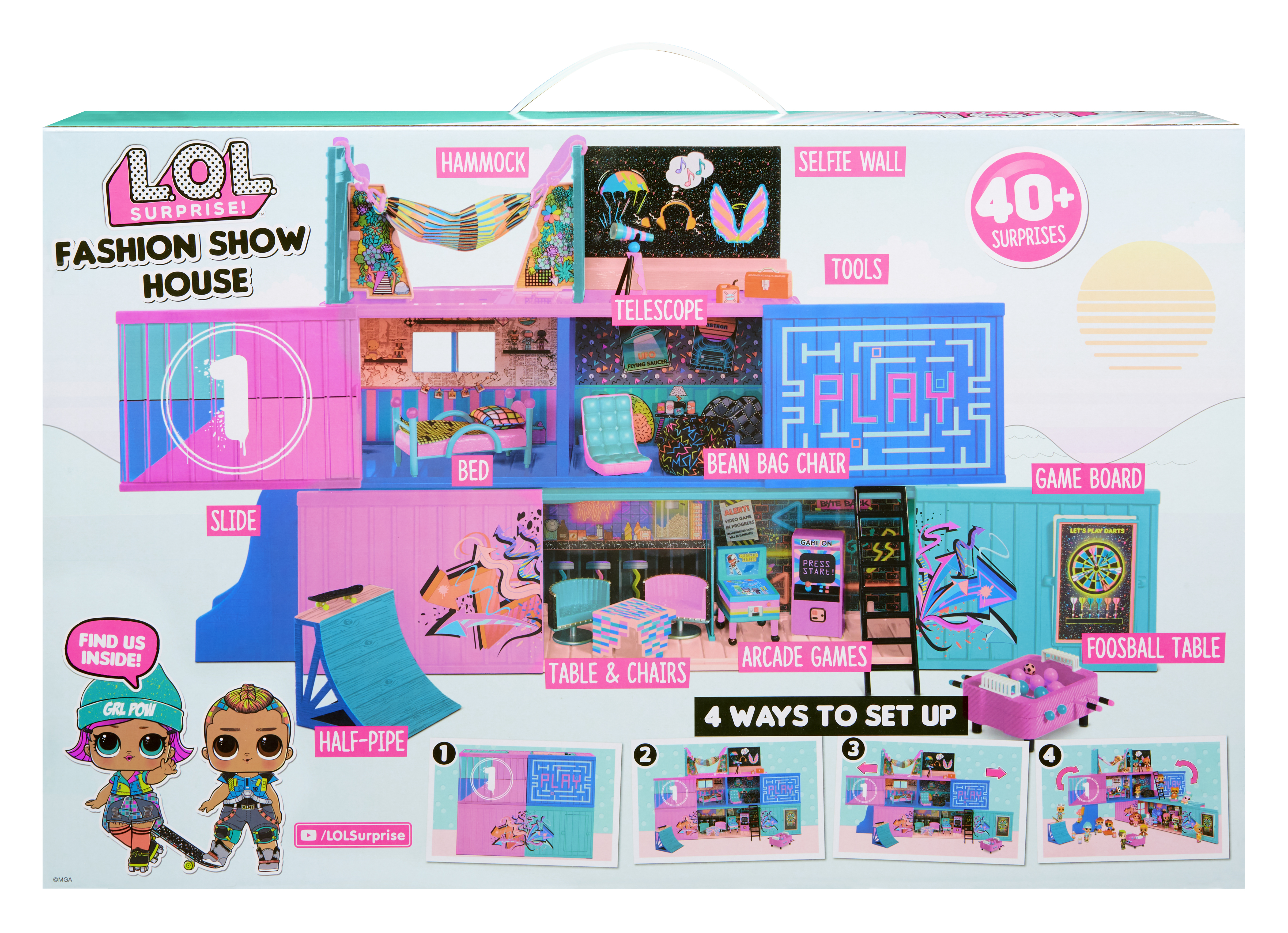 Le nouveau coffret L.O.L. Surprise! Fashion Show House est le meilleur endroit où s’amuser pour tes poupées. Ouvre les deux containers et transforme-les en lieux de rencontre et d’amusement pour tes poupées. Salle de jeu, activités sportives, mobilier exclusif et bien d’autres encore ! Inclut une poupée garçon et une poupée fille exclusifs !