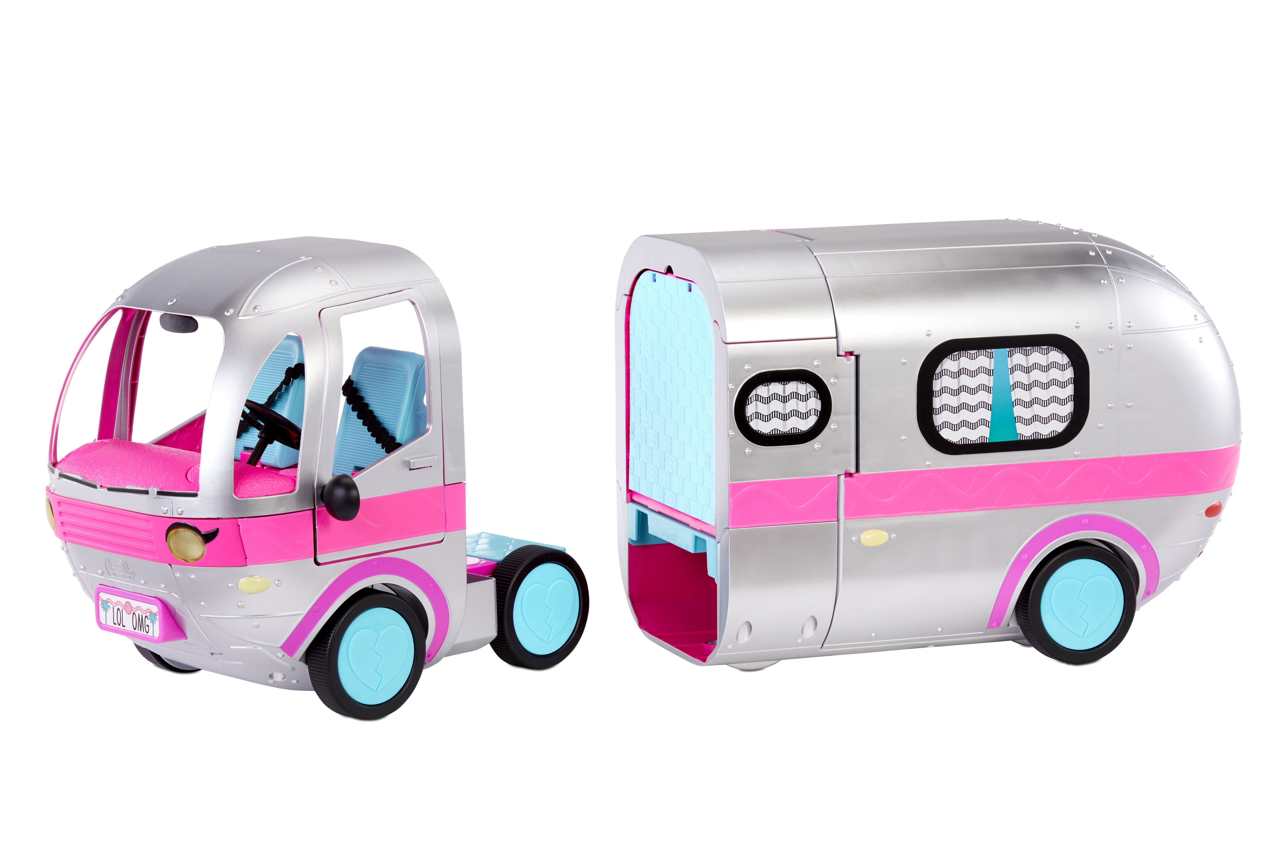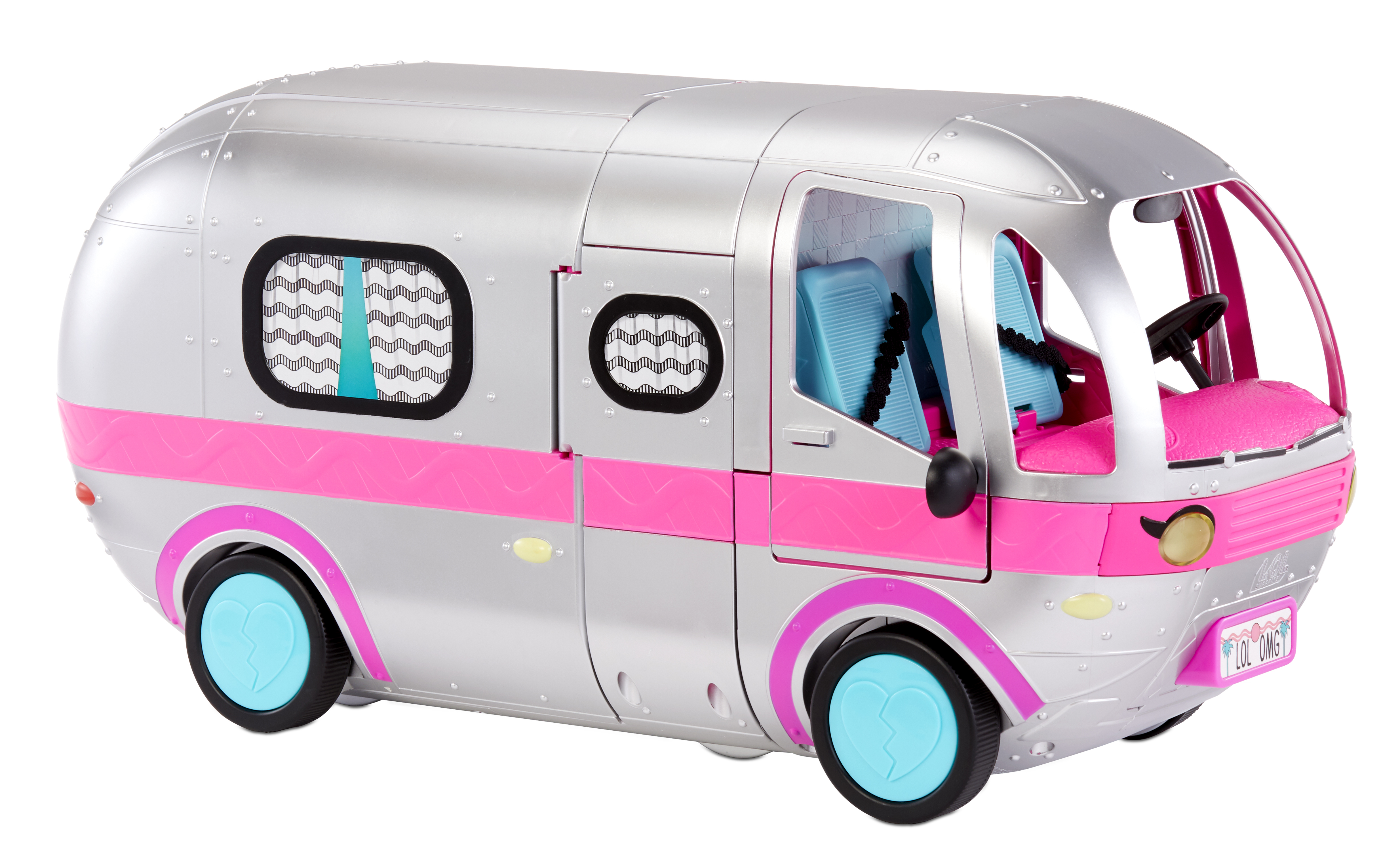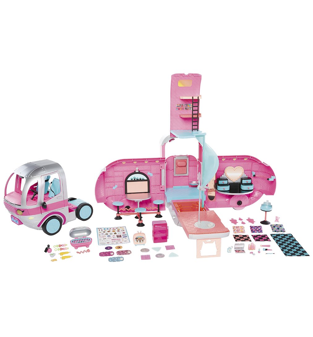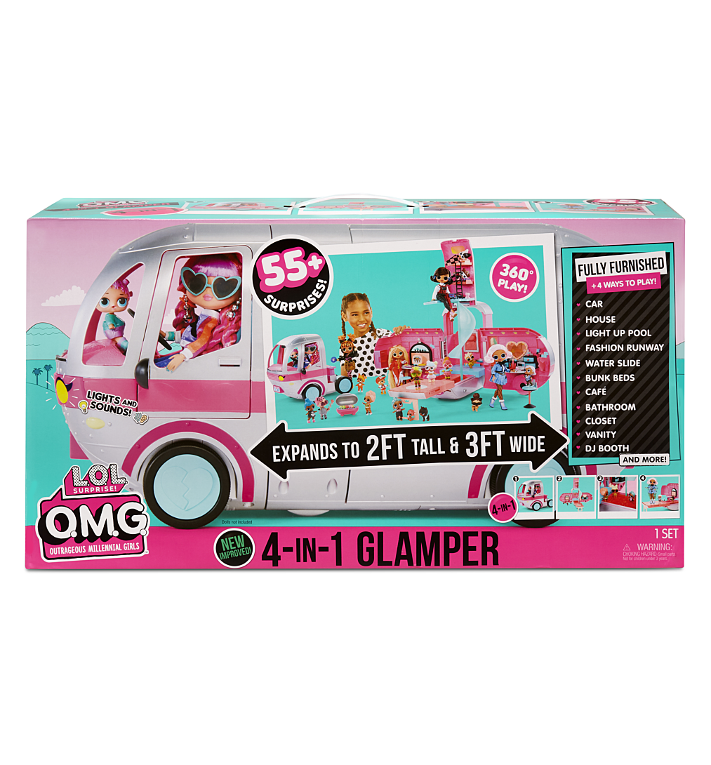 ,L.O.L. Surprise Glamper revient avec un relooking complet! Il est maintenant complétement argenté avec des details rose petillant!! Une fois ouvert, il mesure 90cm de large et 60cm de haut de quoi habriter toutes tes poupées LOL et OMG!