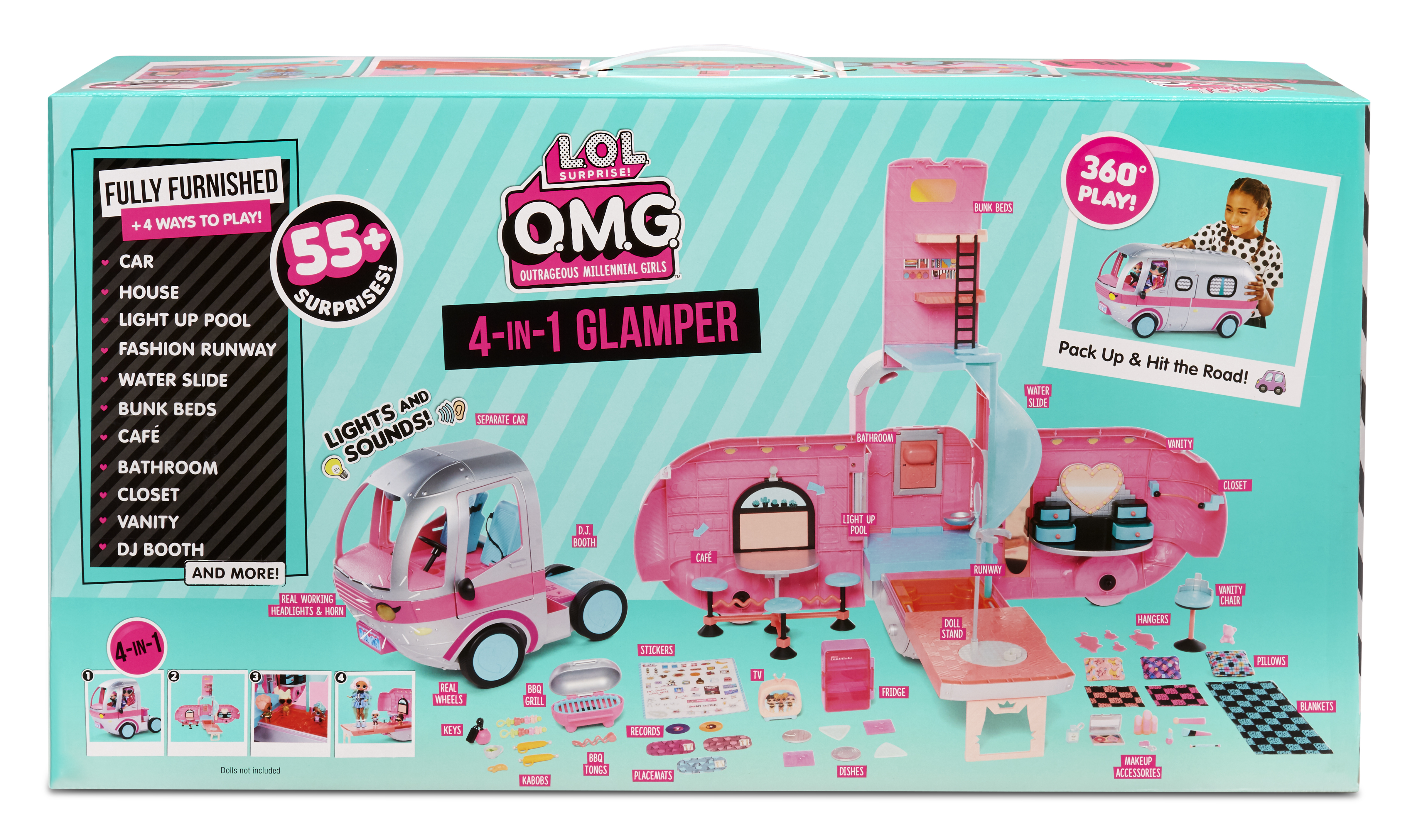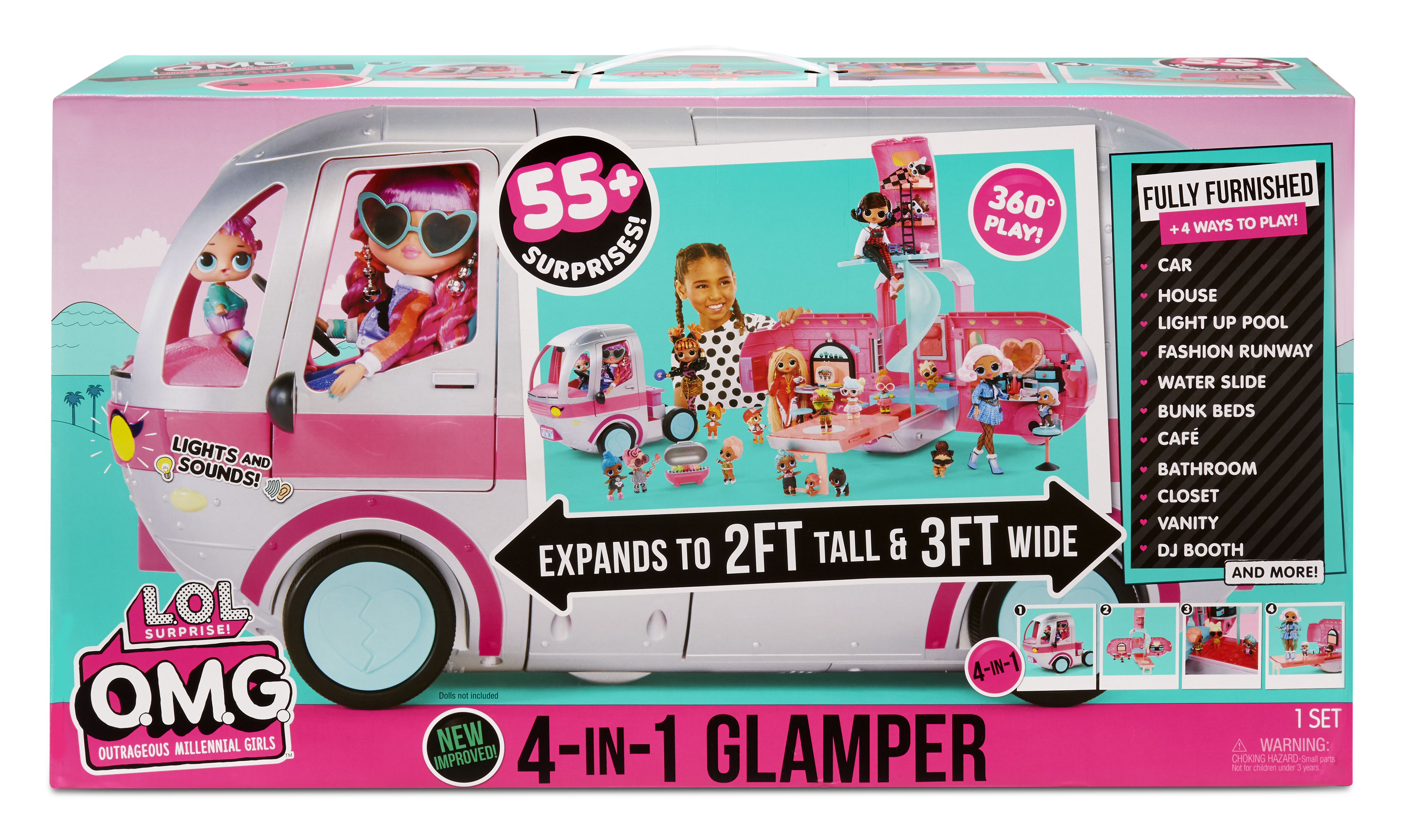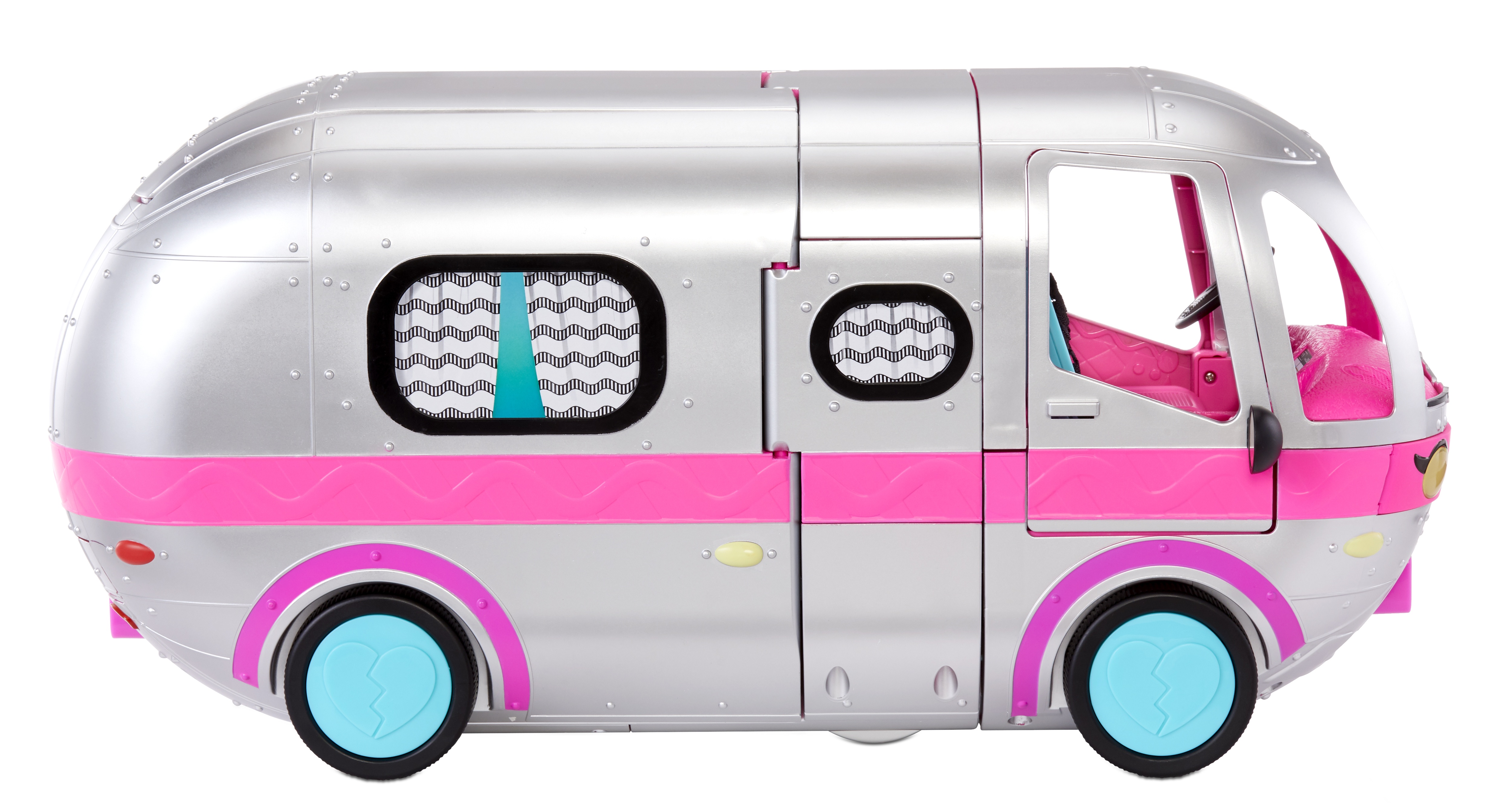 ,L.O.L. Surprise Glamper revient avec un relooking complet! Il est maintenant complétement argenté avec des details rose petillant!! Une fois ouvert, il mesure 90cm de large et 60cm de haut de quoi habriter toutes tes poupées LOL et OMG!