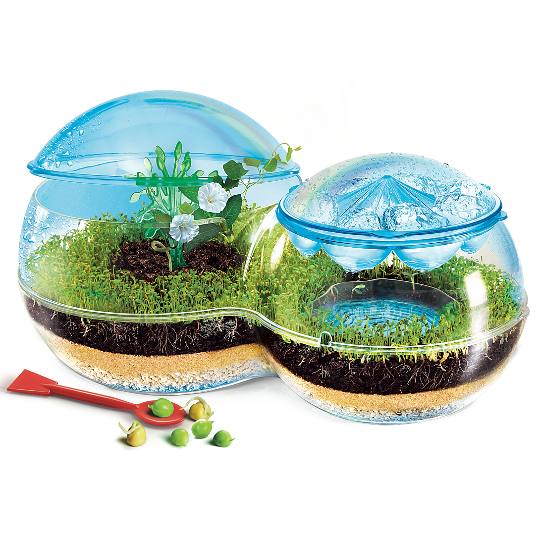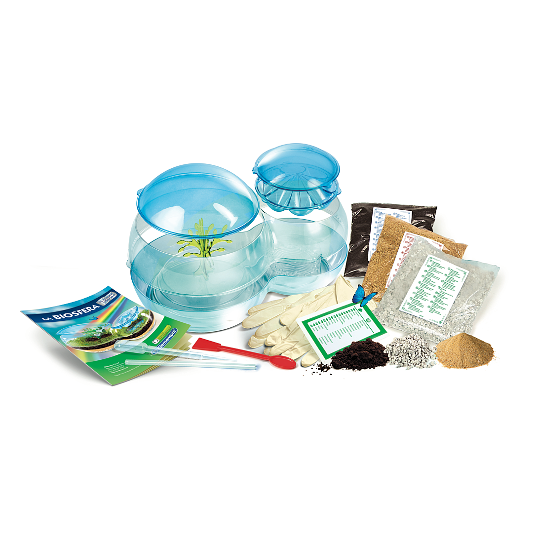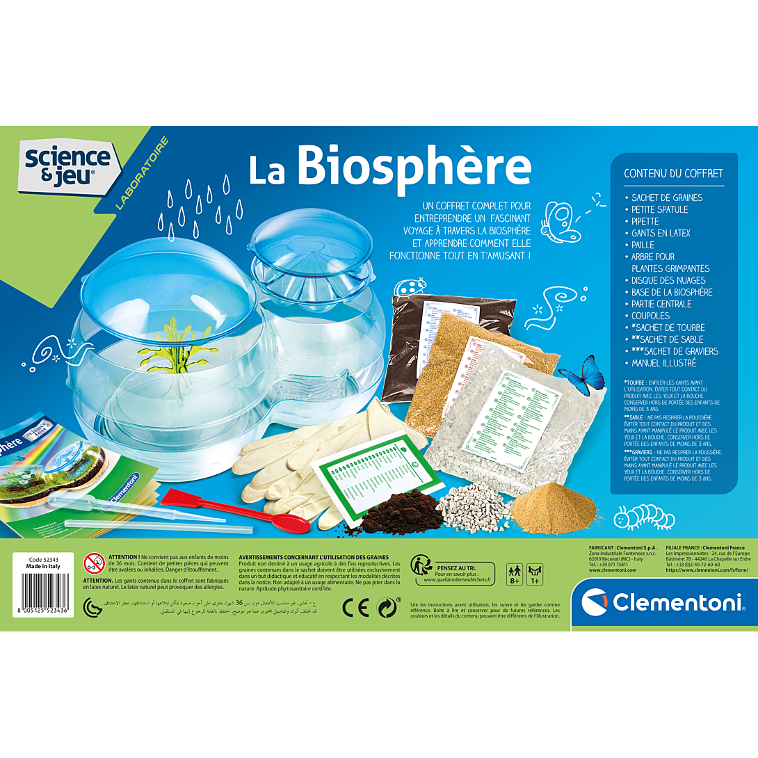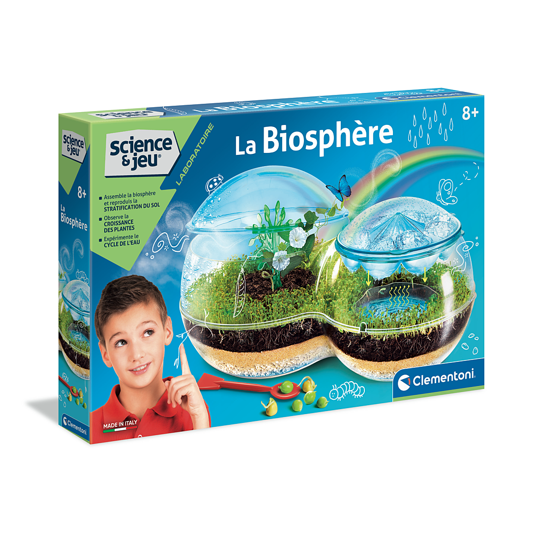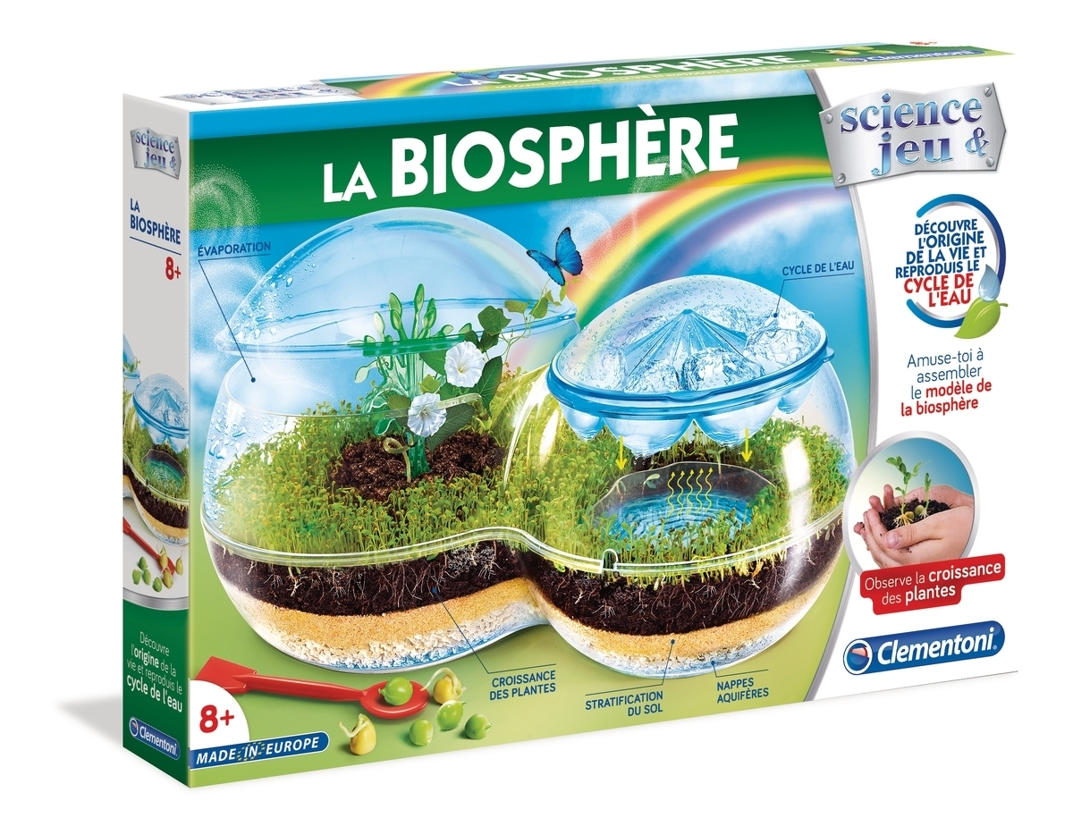 | La boîte contient | Contient un sachet de graines, une petite spatule, une pipette, des gants en latex, une paille, un arbre pour plantes grimpantes, un disque des nuages, une base pour la Biosphère, une partie centrale, des coupoles, un sachet de tourbe, un sachet de sable, un sachet de graviers et un manuel illustré |
