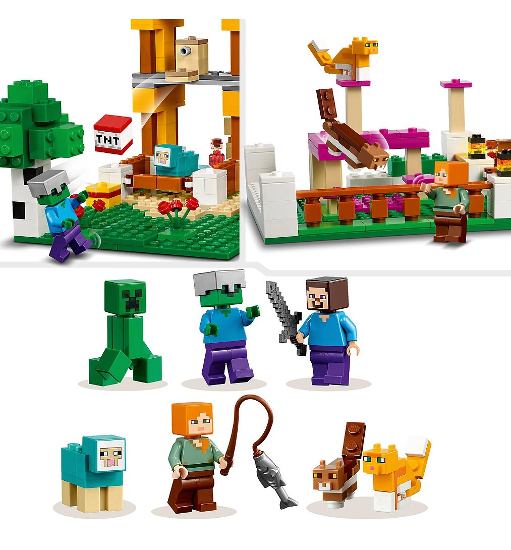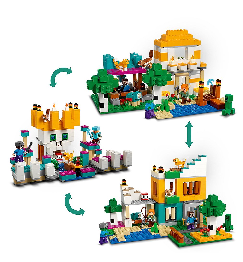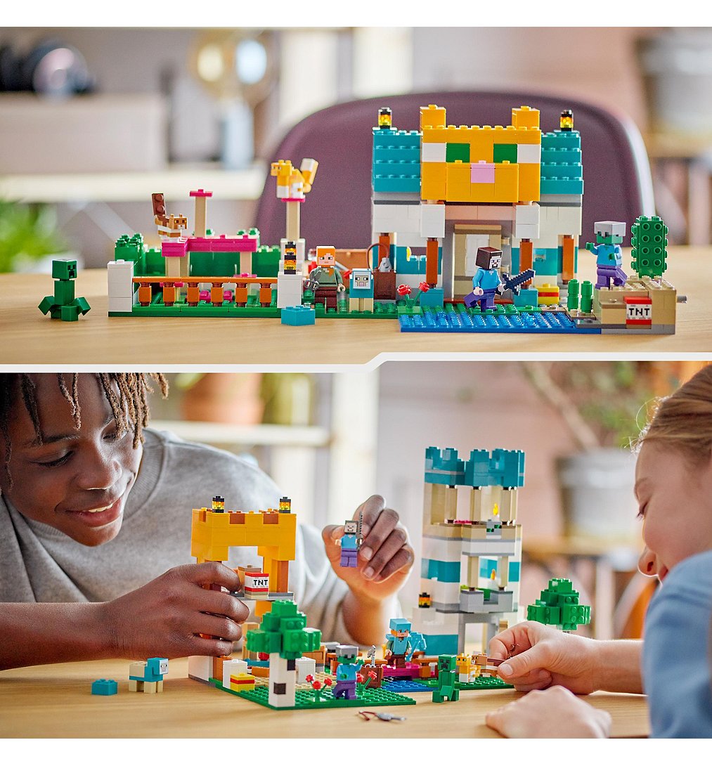 Ce jeu de construction polyvalent offre deux scénarios différents aux enfants : les tours de la rivière, un jouet de château ressemblant à une forteresse qui peut être utilisé pour se défendre contre une attaque de zombies et de Creeper, ou la Cabane du chat, qui consiste en une grande maison Minecraft en forme de chat avec une aire de jeu pour chats à côté. Ces constructions distinctes, ainsi que les modèles suggérés pour inspirer la créativité des enfants et les innombrables structures qu'ils construisent à partir de leur propre imagination, sont peuplées de personnages et d'animaux emblématiques de Minecraft, notamment Steve et Alex, ainsi qu'un zombie, un Creeper, des chats et des moutons. Une foule de caractéristiques et de fonctions Minecraft, y compris des TNT qui explosent, apportent un réalisme supplémentaire à ce jouet LEGO Minecraft épique. Pour plus de plaisir numérique, les constructeurs peuvent zoomer, faire pivoter les ensembles en 3D et suivre leur progression à l'aide de l'application amusante et intuitive LEGO Builder.