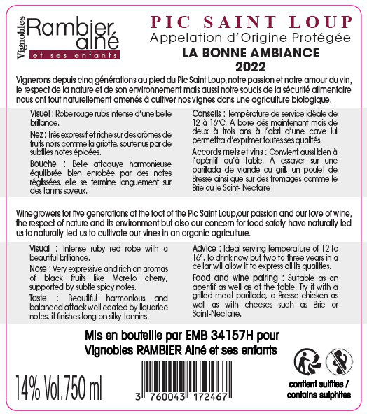 | Libellé | La Bonne Ambiance, 2023 - Pic-Saint-Loup AOP - Rouge - 75 cl |