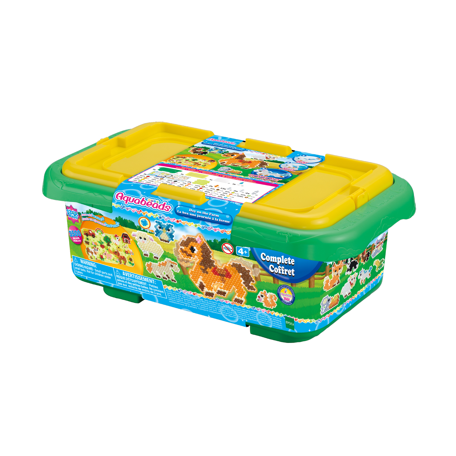 Met en scène la vie à la ferme grâce à la base de création ! Crée tes animaux préférés (cheval, mouton, chien, etc…) et décore ta chambre avec ! Le principe est simple : assemble les perles, vaporise de l'eau, laisse sécher et c'est prêt ! Il suffit de clipser tes créations sur la base pour la décorer ! Elle contient plus de 3500 perles de différentes formes (dont les perles étoiles), 2 bases de création pour les fixer et décorer ta chambre et l’essentiel pour des heures de créativité avec Aquabeads ! Dès 4 ans