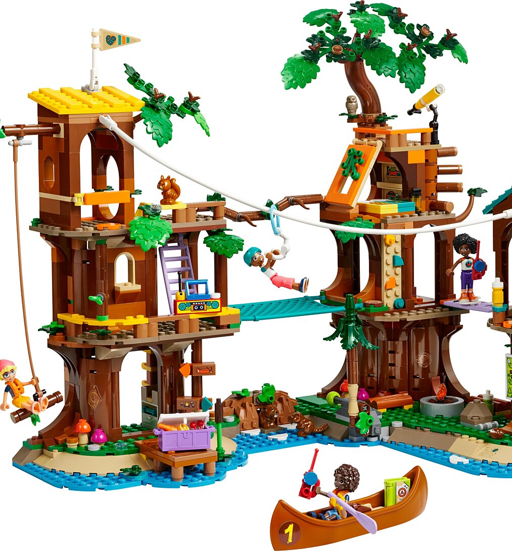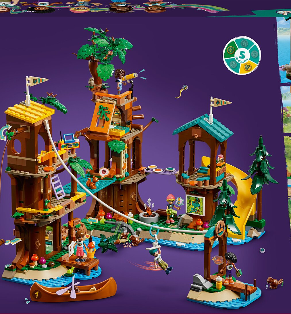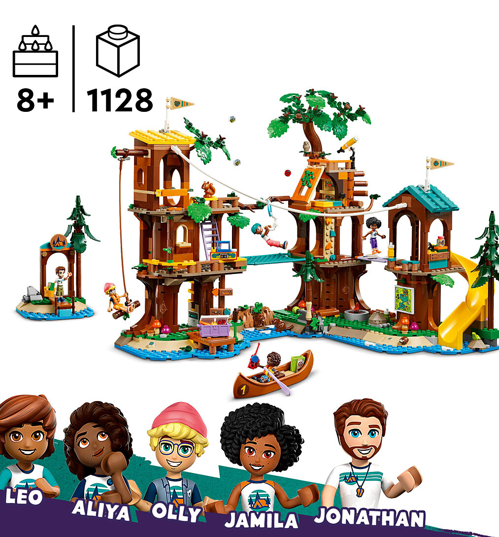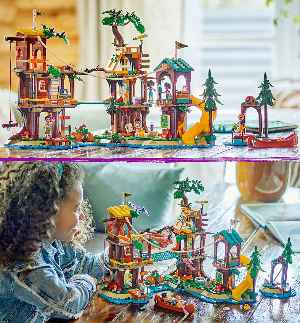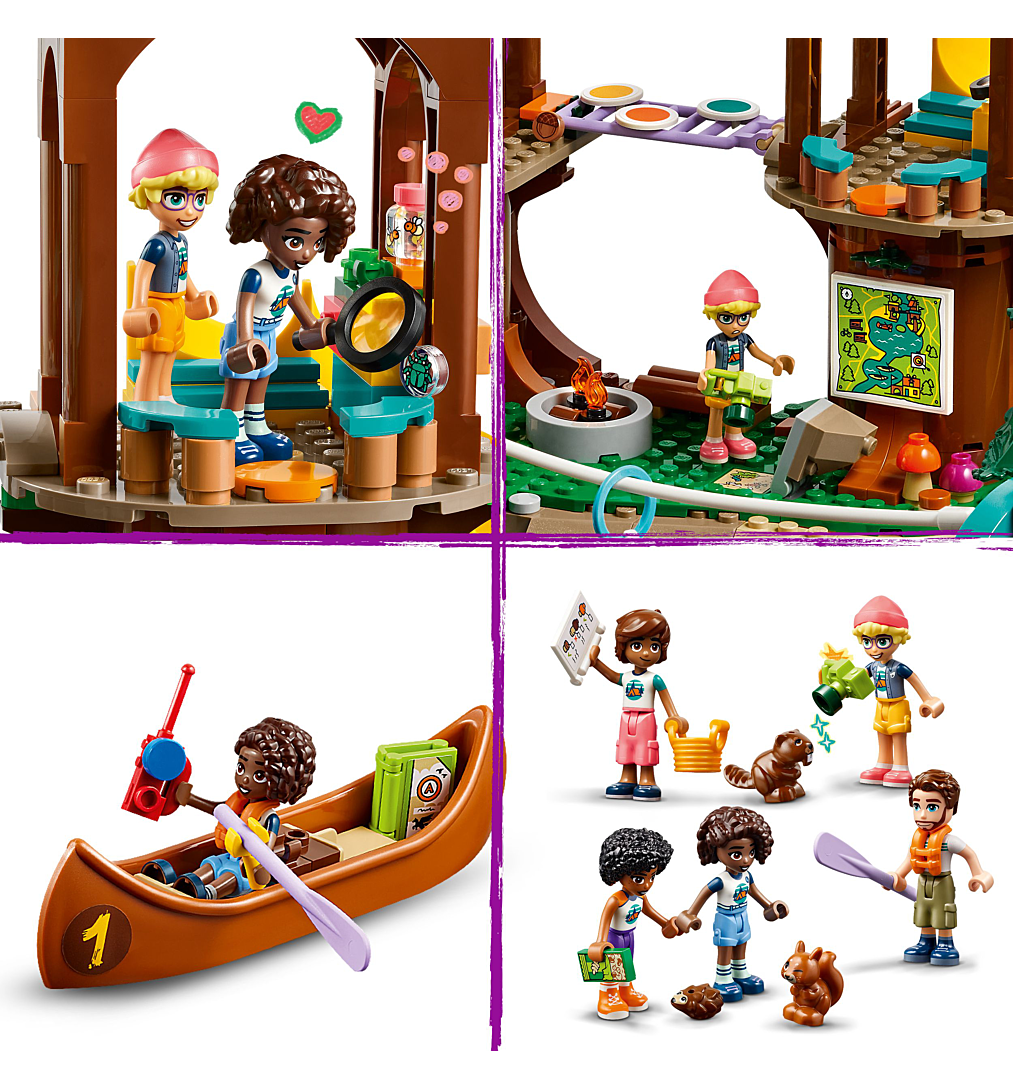 La cabane dans l’arbre de la base de loisirs LEGO Friends (42631) stimule l’imagination des filles et des garçons dès 8 ans, qui peuvent faire tester de nouvelles activités aux amis Léo, Aliya, Djamila et Olly guidés par l’animateur Jonathan. Ce set LEGO regorge de fonctionnalités amusantes et inclut 5 mini-poupées LEGO, des accessoires et de nombreux animaux, dont 2 castors qui construisent un barrage. Les personnages font de la tyrolienne ou de la course d’obstacles, le set comprend un pont en bois, un mur d’escalade et des trappes. Il y a également des activités comme du canoë, ainsi qu’une île accessible en bateau ou en tyrolienne ! Votre petit explorateur peut emmener les personnages à la chasse aux insectes : va-t-il trouver tous les insectes cachés et obtenir le badge ? Cherchez l’adorable écureuil qui a construit sa cachette en haut d’un arbre ! Ce jouet LEGO est une belle idée de cadeau pour les filles et les garçons qui aiment les cabanes dans les arbres et les sets de jeu nature.