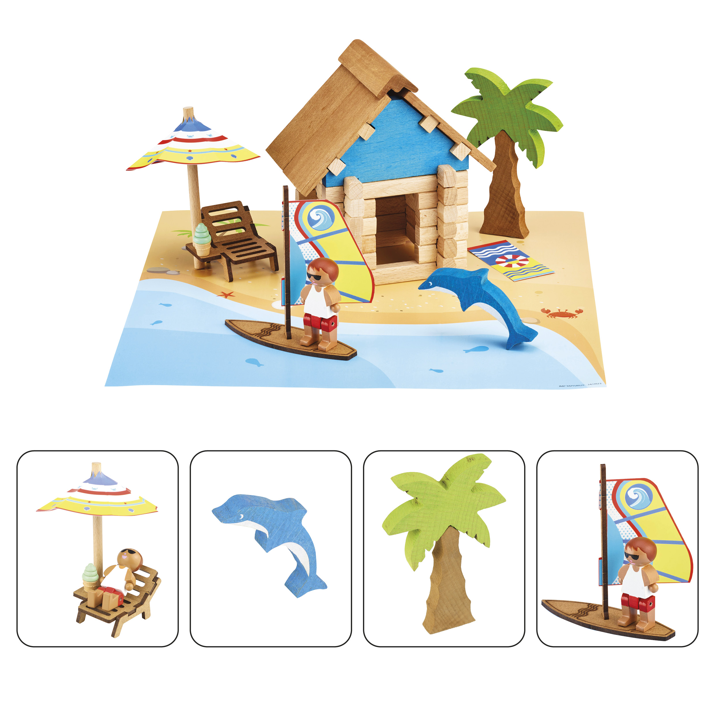 La Cabane de Plage - 55 pièces : jeu de construction en bois naturel et teinté avec une notice de montage, un tapis de jeu et de nombreux accessoires. Coffret carton : 22 x 18,5 x 8,5 cm - A partir de 5 ans