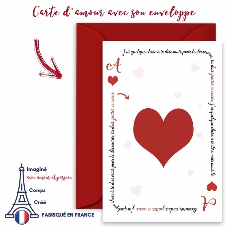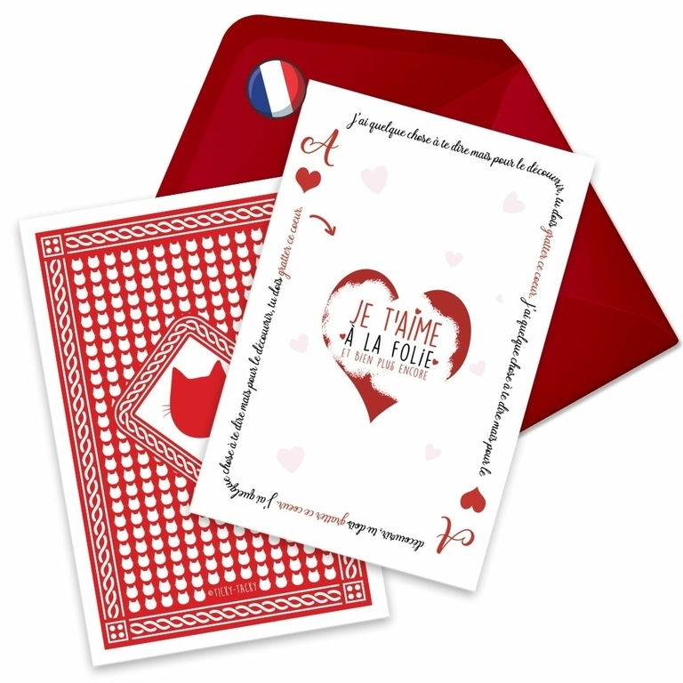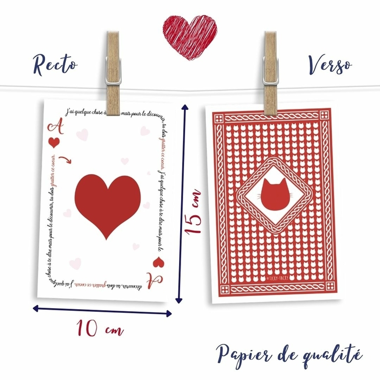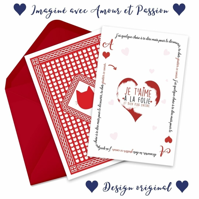UNE JOLIE CARTE A GRATTER pour déclarer son amour à sa moitié ! Une déclaration originale avec un petit chat tout mignon qui tient un ballon contenant un message secret à découvrir... UNE CARTE POUR DIRE Je t'aime ...un peu, beaucoup, énormément, à la folie ! Une carte pour la fête des amoureux, une attention d'amour au sein du couple pour tous les jours. VOUS POUVEZ apporter en option une note de douceur en accompagnant cette carte d'une sucette en forme de coeur. Un duo plein d'amour à croquer et à craquer ! PRÉSENTATION : une carte imprimée de dimensions 10 cm x 15 cm sur un papier de très belle qualité accompagnée de son enveloppe rouge. COCORICOOO ! Nos créations sont 100% françaises ! Nous sélectionnons avec beaucoup de soin nos différents partenaires. Pour le conditionnement de nos produits, nous travaillons avec une entreprise adaptée qui a pour mission l’insertion professionnelle et sociale de travailleurs handicapés. IMAGINÉS avec Amour, Passion et Agréés par nos 3 enfants ! Imaginées, pensées et conçues pour apporter le plein de joie !