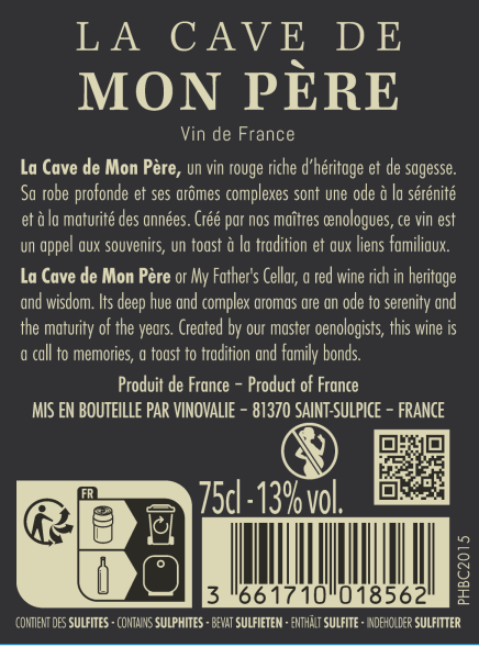 | Libellé | La Cave de mon Père - Vin de France - Rouge - 75 cl |
