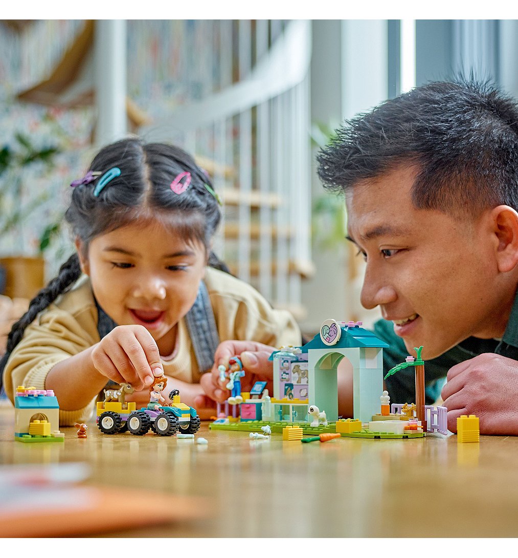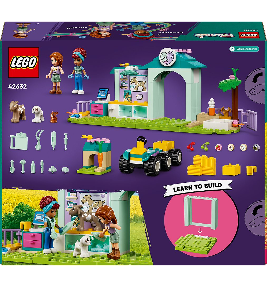 La Clinique Vétérinaire des Animaux de la Ferme LEGO Friends (42632) est un excellent jouet vétérinaire pour stimuler l'intérêt des enfants de 4 ans et plus pour les soins aux animaux et leur enseigner la construction. La clinique vétérinaire à construire, 2 figurines LEGO Friends, 3 figurines d'animaux de la ferme et des accessoires vétérinaires permettent à votre enfant de jouer de manière particulièrement imaginative. Avec ce jouet de ferme, votre enfant peut créer ses propres histoires d'amitié et, par exemple, laisser Autumn et la vétérinaire s'occuper de la figurine de la chèvre nouveau-née. Les deux chargent les figurines d'animaux sur la remorque du jouet tracteur et les emmènent à la clinique. Utilisez le bureau, la balance, l'ordinateur et la lampe pour examiner les figurines de chèvre et de lapin. Ensuite, aidez Autumn à donner un bain aux animaux LEGO et offrez-leur une friandise à grignoter. De plus, l'application LEGO Builder offre à votre enfant une aventure de construction facile et intuitive. L'application permet à votre enfant d'agrandir et de faire pivoter des vues 3D des modèles, de sauvegarder des ensembles et de suivre ses progrès de construction. Les ensembles LEGO dès 4 ans facilitent la construction pour les enfants avec des éléments de construction de départ pratiques et un peu plus grands. Cet ensemble LEGO Friends Animaux de la ferme avec jouet vétérinaire est une excellente idée cadeau pour les enfants qui aiment jouer à être vétérinaires.