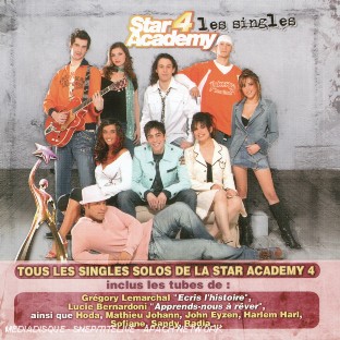 | Liste des pistes | 1.1 . ecris l'hstoire - Esposito, Davide,De Benedittis, Francesco,Lemarchal, Gregory,Manners, Paul,Star Academy 4 1.2 . aux portes e l'hiver - Vié, Christian,Lucie Bernardoni,Star Academy 4,Bernados, Yorgos 1.3 . j'te reconnais pas - Johann, Mathieu,Auvray, Nicolas,Star Academy 4 1.4 . quelqu'un pour quelqu'un - Heinrich, Benoît,Hoda,Spada, Lisa,Dunoyer, Nicolas,Star Academy 4 1.5 . comme a l'ancienne - Sofiane,Lambert, Sofiane,Star Academy 4,Clerc, Stephane,Amar, Ygal 1.6 . je dansais - Eklund, Daniel,Sandy,Star Academy 4,Sela, Winston 1.7 . dans les halles (jaloux) - Parmentier, Fabien,Harl, Harlem,Semighouni, Nabil,Star Academy 4 1.8 . un peu de poudre persane - Hattemberg, Philippe,Radia,Star Academy 4,Brunello, Stéphane 1.9 . sale temps - Chaduteau, Cécile,Eyzen, John,Falcao, Philippe,Lorain, Pierre,Marie, Pierre,Star Academy 4 1.10 . apprends-nous a rever - Lucie Bernardoni,Star Academy 4 1.11 . on passe a l'heure d'hiver - Auvray, Beatrice,Johann, Mathieu,Auvray, Nicolas,Star Academy 4 1.12 . j'irai là-bas - Chaduteau, Cécile,Eyzen, John,Marie, Pierre,Star Academy 4,Coriat, Yvan 1.13 . juste par amour - Hoda,Star Academy 4,Karlsson, Tobias 1.14 . la jalousie - Fraikin, Frederic,Olivier, Jeremy,Gaspar, Ondine,Sandy,Francois, Sandy,Star Academy 4,Moschitta, Vanessa 1.15 . belle et sereine - Radia,Star Academy 4 |