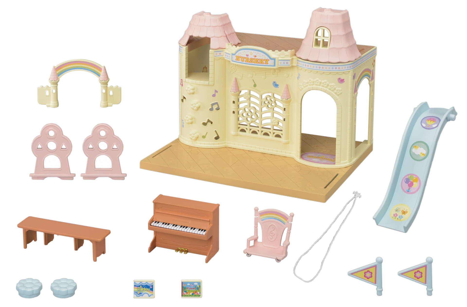 Cette crèche en forme de château est livrée avec de nombreux accessoires de jeu, tels qu'un piano, un toboggan, une balançoire et un banc pouvant être transformé en balançoire double. En modifiant la position du sol, vous pouvez créer différents univers : une pièce plus grande ou un jardin sur lequel les accessoires de jeu peuvent être placés. Le château des bébés (5319) peut être positionné sur le toit afin d'agrandir la crèche.
