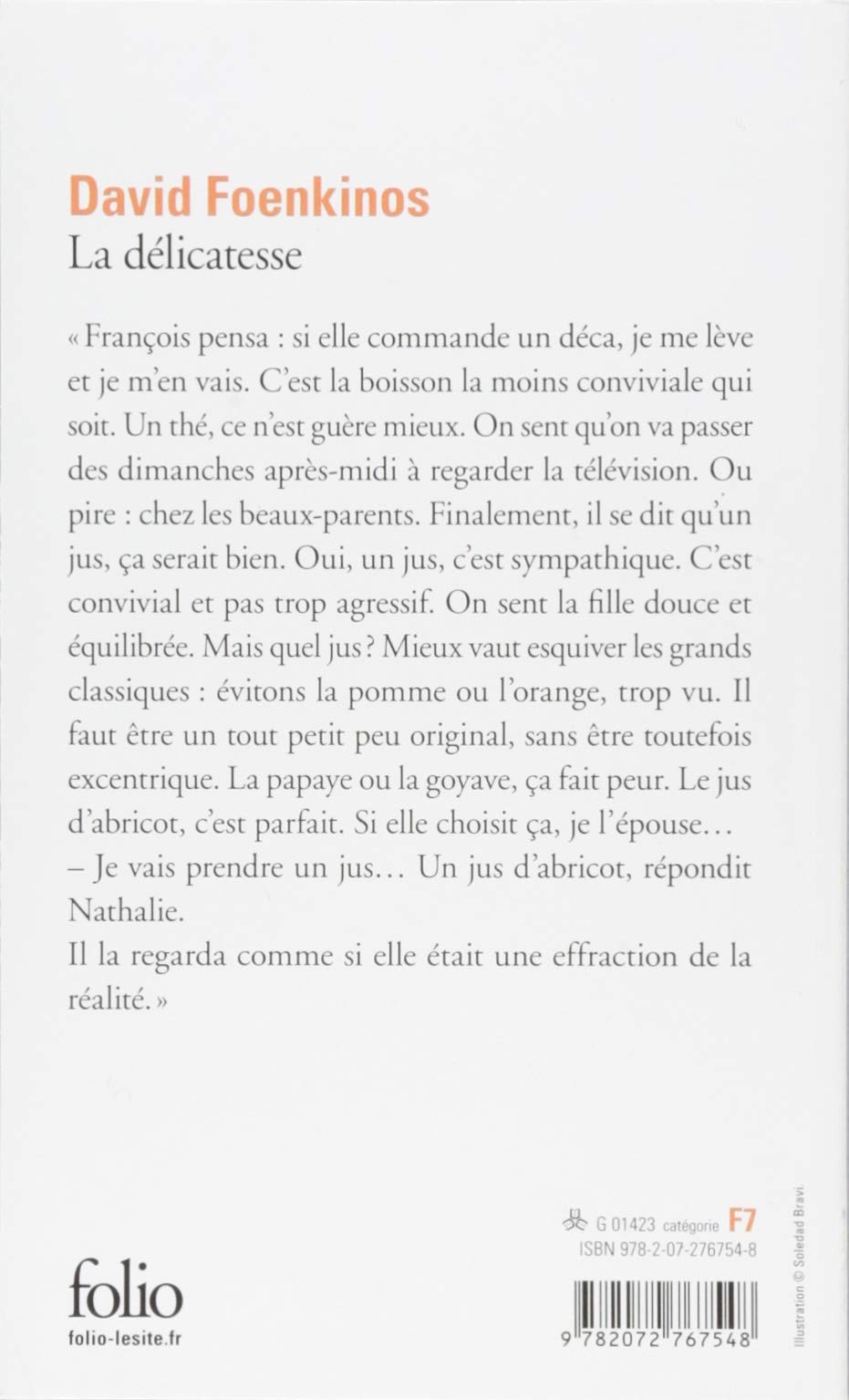 "François pensa : si elle commande un déca, je me lève et je m'en vais. C'est la boisson la moins conviviale qui soit. Un thé, ce n'est guère mieux. On sent qu'on va passer des dimanches après-midi à regarder la télévision. Ou pire : chez les beaux-parents. Finalement, il se dit qu'un jus ça serait bien. Oui, un jus, c'est sympathique. C'est convivial et pas trop agressif. On sent la fille douce et équilibrée. Mais quel jus ? Mieux vaut esquiver les grands classiques : évitons la pomme ou l'orange, trop vu. Il faut être un tout petit peu original, sans être toutefois excentrique. La papaye ou la goyave, ça fait peur. Le jus d'abricot, ça serait parfait. Si elle choisit ça, je l'épouse... - Je vais prendre un jus... Un jus d'abricot, je crois, répondit Nathalie. Il la regarda comme si elle était une effraction de la réalité." La délicatesse a obtenu dix prix littéraires et a été traduit dans plus de quinze langues.