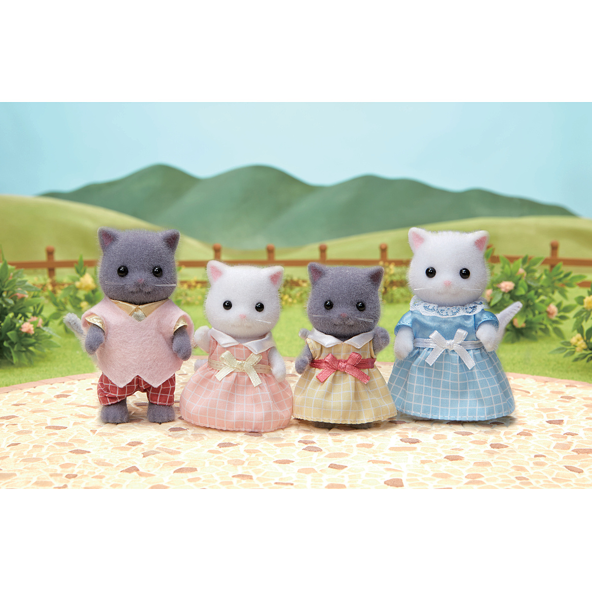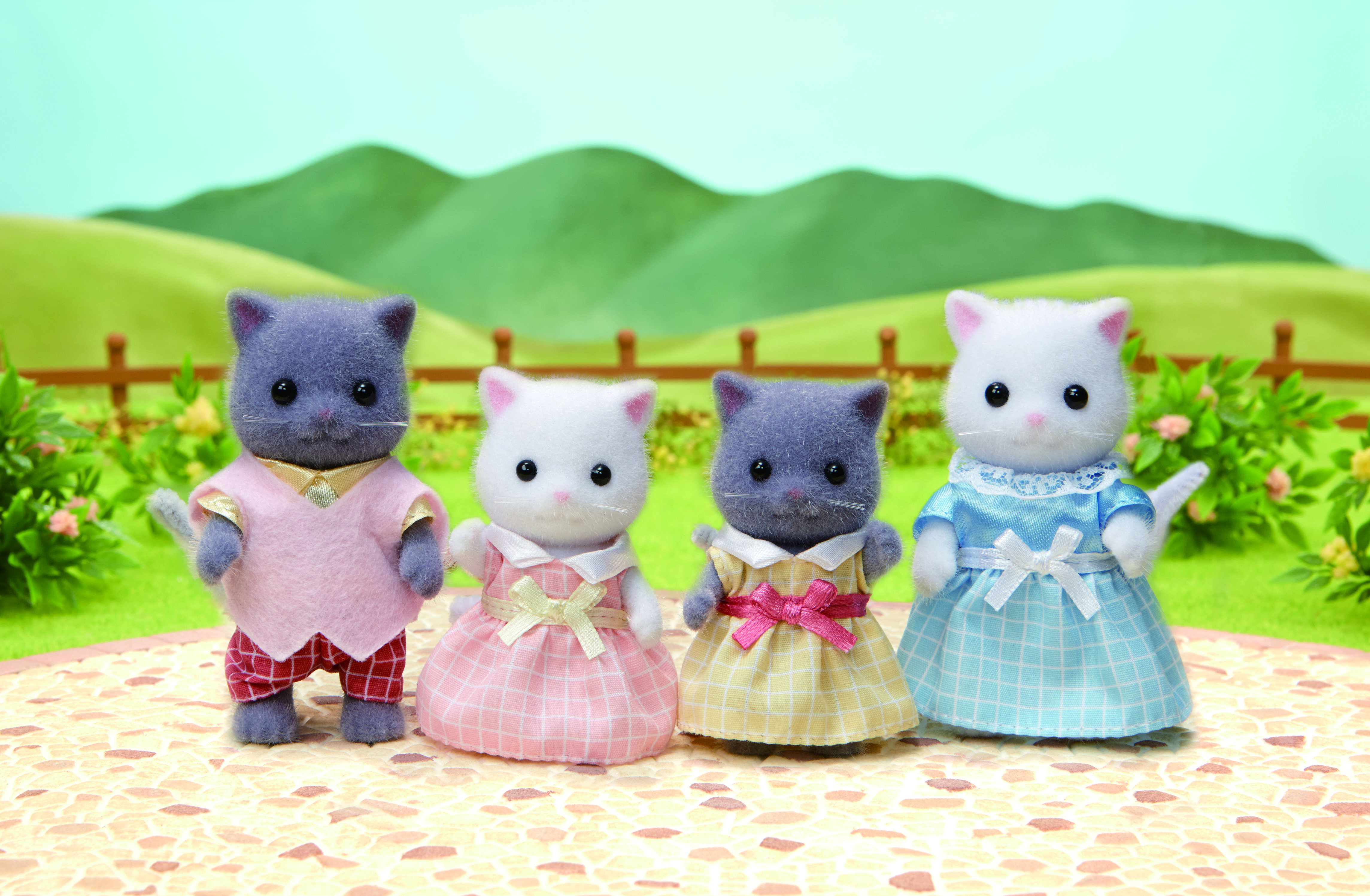 La famille Chat Persan est composée de 4 personnages : la maman, le papa, le fils et la fille. Ils sont tous articulés et habillés avec soin. Leurs vêtements peuvent être enlevés et remis à loisir.
