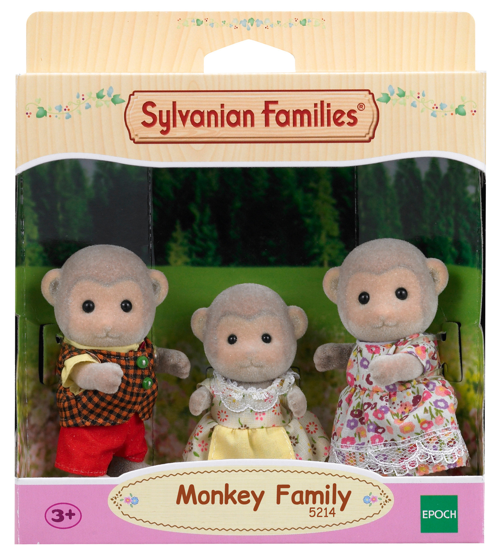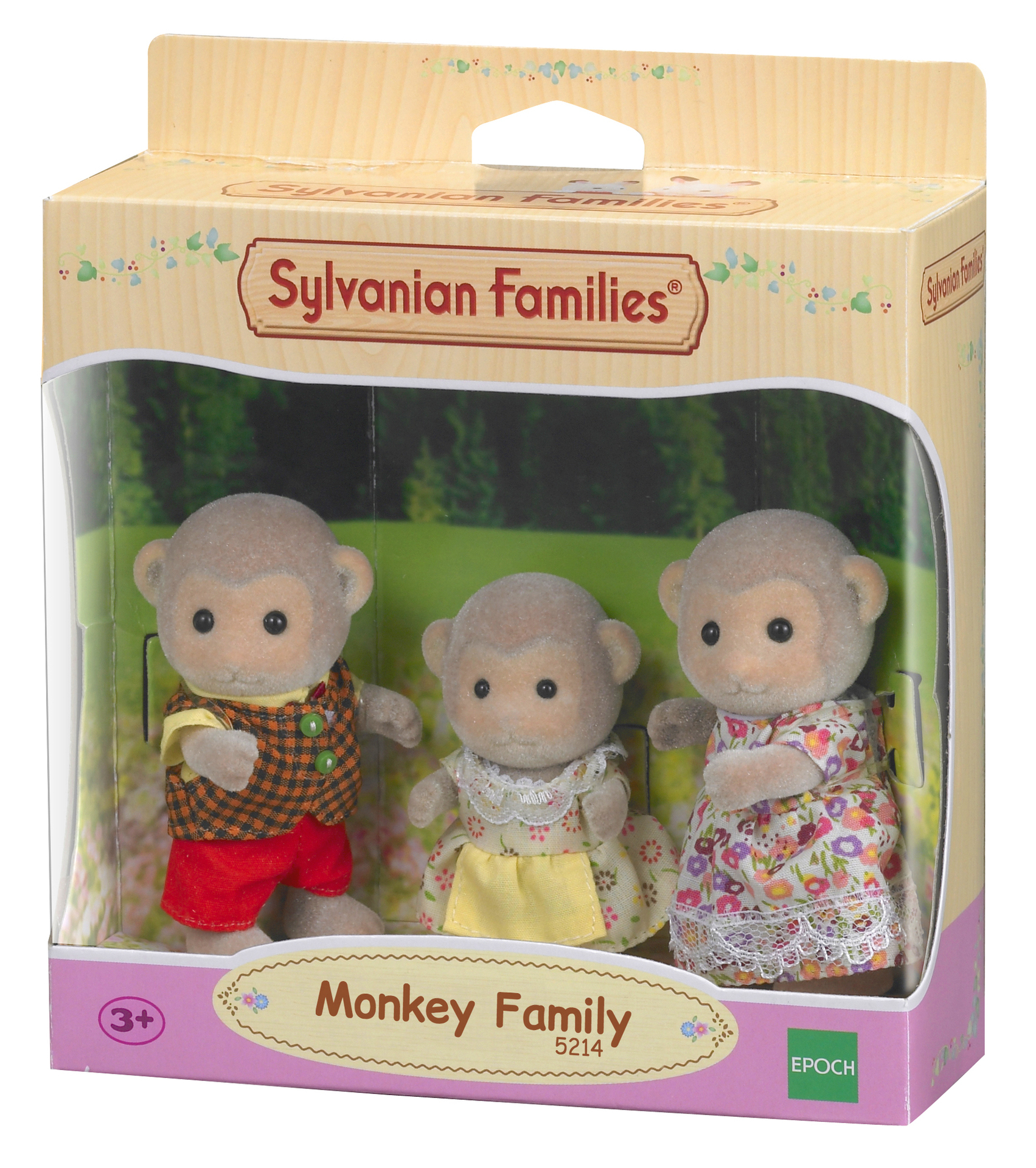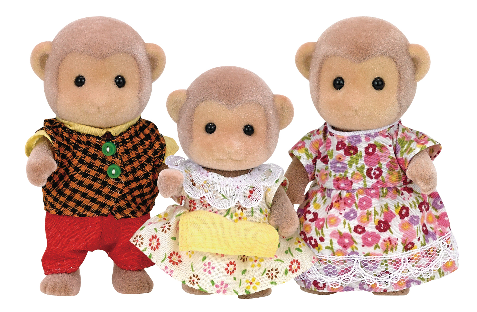 La famille singe est composée de 3 personnages : la maman, le papa, et leur fille. Ils sont tous articulés et habillés avec soin. Leurs vêtements peuvent être enlevés et remis à loisir.