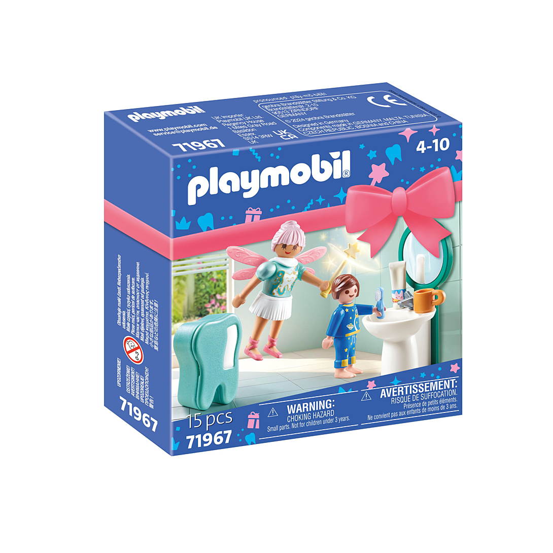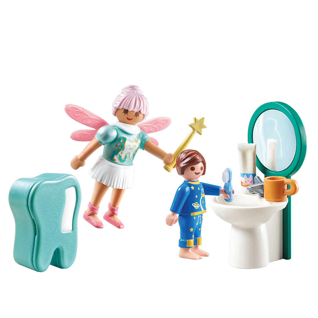 Personnages : 1 fée, 1 garçon Accessoires : 1 boîte, 1 lavabo avec miroir, 1 brosse à dents, 1 dentifrice, 1 gobelet, 1 baguette magique