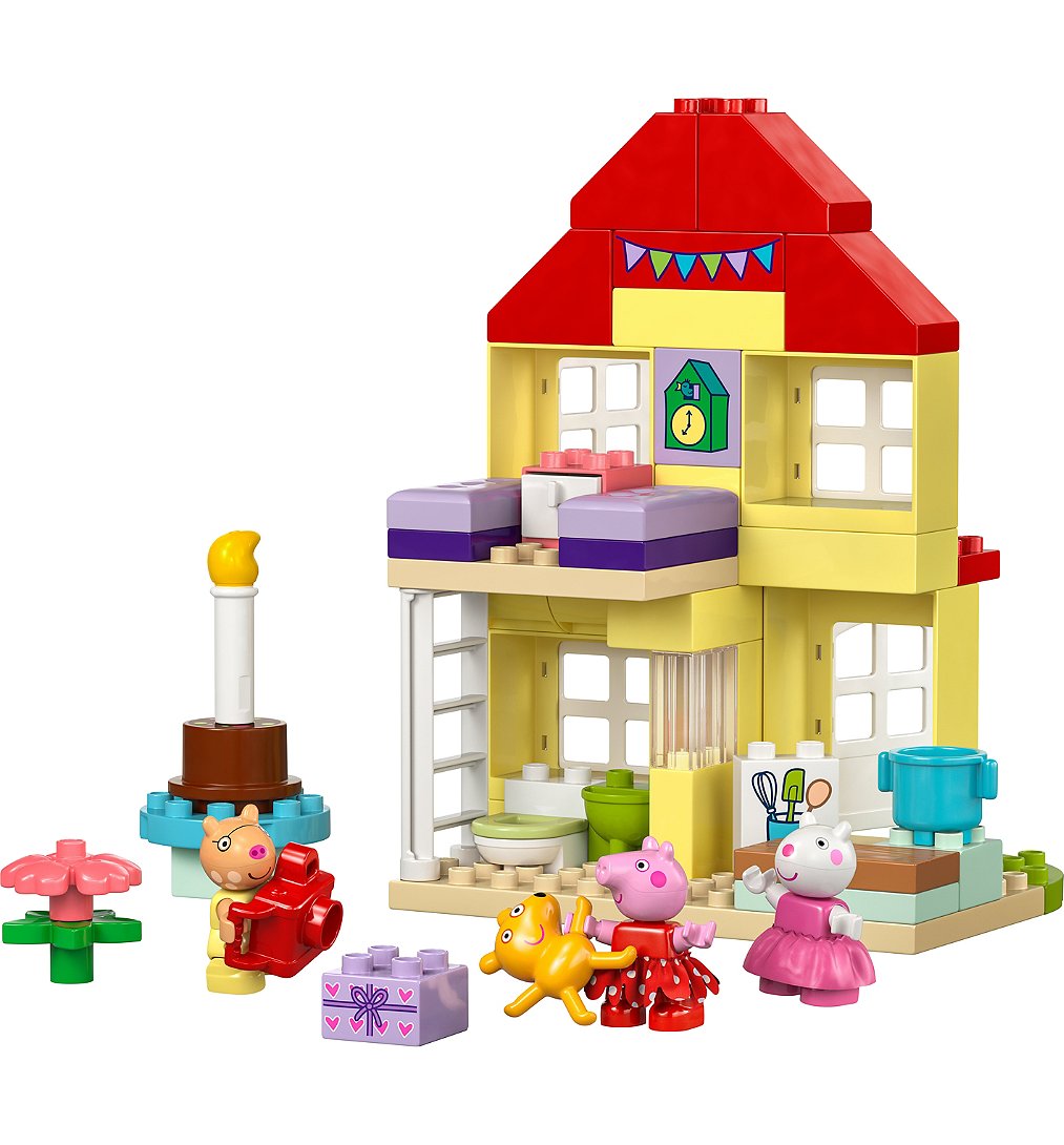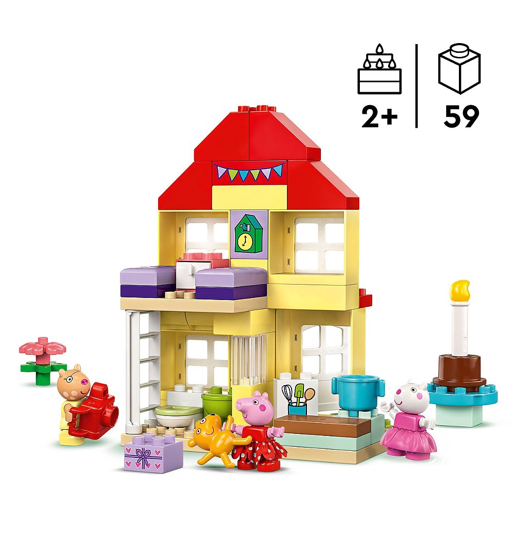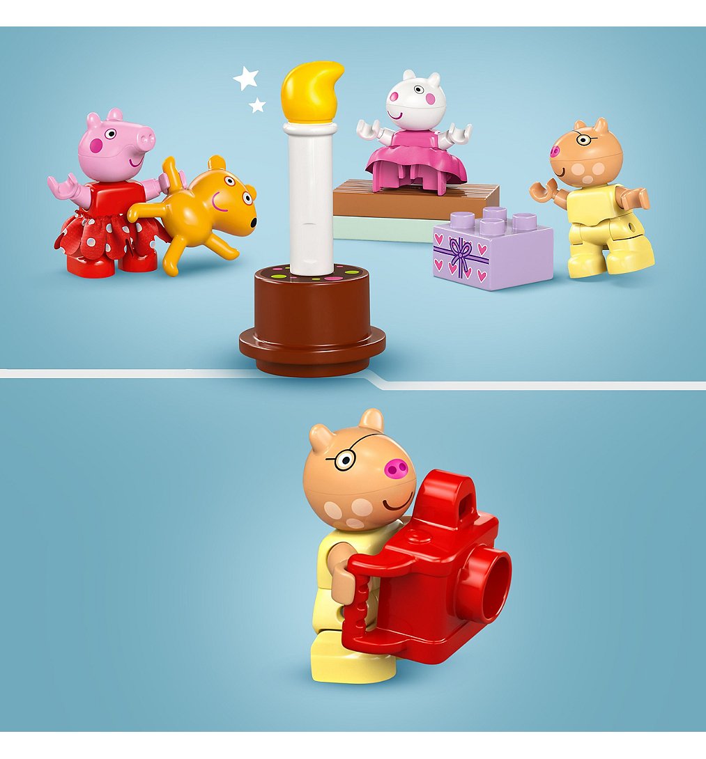 Faites le bonheur d’un fan de Peppa Pig en l’invitant à un anniversaire ! Avec La fête d’anniversaire chez Peppa Pig (10433), les enfants dès 2 ans font la fête aux côtés de Peppa et ses amis. Ce jouet Peppa Pig regorge de détails de la série TV. Il inclut les figurines de Peppa, Pedro Pony et Suzy Sheep, ainsi que le doudou de Peppa, Teddy. Dans la maison, il y a une chambre accessible par un escalier et une cuisine où les tout-petits peuvent jouer à préparer un gâteau. Il y a également une salle de bain avec un lavabo, idéale pour expliquer aux petits l’importance de se laver les mains, surtout avant de manger du gâteau ! Les jouets LEGO® DUPLO® Peppa Pig à construire et reconstruire contribuent à l’éveil des tout-petits. En s’amusant à accueillir leurs amis, à recevoir des cadeaux et à couper le gâteau, comme dans un vrai anniversaire, les enfants développent leur capacité de raisonnement. Ils apprennent également à s’exprimer en recréant la fête.
