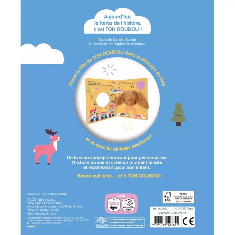 Aujourd'hui, le héros de l'histoire, c'est ton doudou ! p Un livre au concept innovant : passe la tête de ton doudou dans la découpe traversante du livre pour le faire devenir le héros de ton histoire du soir. br/ Une histoire du soir personnalisée pour un moment de partage et de tendresse entre parent et enfant. /p