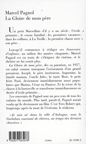 La Gloire de mon père, dès sa parution, en 1957, est salué comme marquant l'avènement d'un grand prosateur. Joseph, le père instituteur, Augustine, la timide maman, l'oncle Jules, la tante Rose, le petit frère Paul, deviennent immédiatement aussi populaires que Marius, César ou Panisse. Et la scène de la chasse à la bartavelle se transforme immédiatement en dictée d'école primaire...