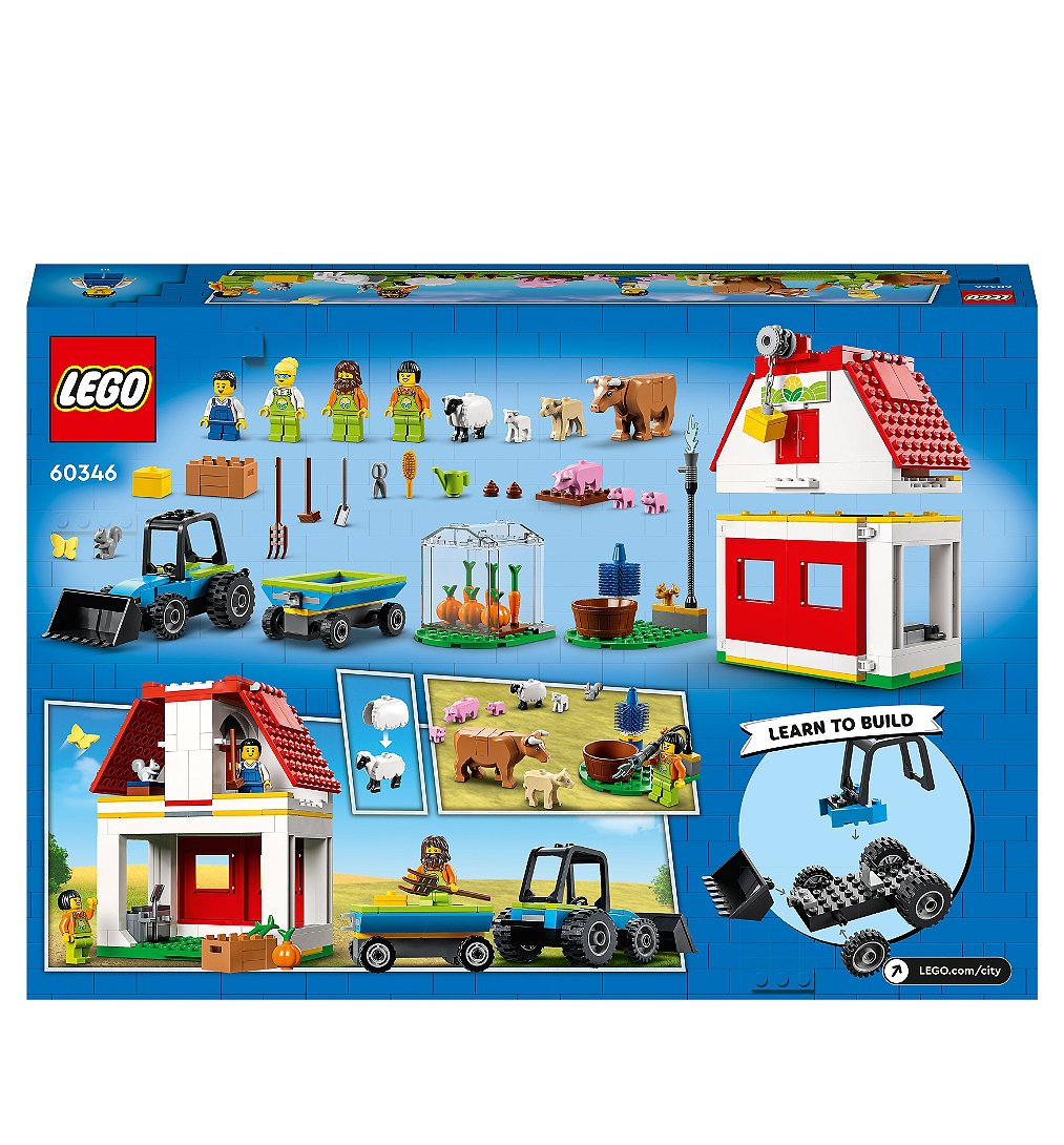 | La boîte contient | • Des animaux de la ferme dès 4 ans – Les enfants s’amusent à la ferme avec le set La grange et les animaux de la ferme LEGO® City (60346), incluant des animaux et des personnages inspirants pour des heures de jeu d’imagination • Que contient la boîte • – Tout le nécessaire pour créer une grange, une serre, un tracteur et sa remorque, mais aussi 4 minifigurines, dont une héroïne de la série LEGO® City, un écureuil, un mouton, un agneau, un cochon, un porcelet et une vache • Fonctions amusantes – Les enfants peuvent utiliser le treuil de la grange pour charger la remorque du tracteur, ouvrir le toit pour accéder au grenier à foin et s’amuser à prendre soin des animaux • Un cadeau pour les amis des animaux – Ce jouet LEGO® sur le thème de la ferme peut être offert pour un anniversaire, les fêtes ou toute autre occasion, à un enfant de 4 ans ou plus • Dimensions – Une fois construite, la grange mesure plus de 9 cm de haut, 6 cm de large et 5 cm de profondeur • Inclut des accessoires pour minifigurines LEGO® – Ce set de la ferme inclut une pelle, des cisailles, une fourche, un balai et un arrosoir • Pour les jeunes constructeurs – Ce set 4+ comprend une brique de démarrage LEGO® et des instructions papier en images. Un guide numérique interactif est également disponible dans l’appli gratuite Instructions de montage LEGO • Des jouets qui aident les enfants à apprendre – Les bâtiments, véhicules et personnages des sets LEGO® City favorisent le jeu d’imagination et aident les enfants à développer des compétences créatives et leur confiance en eux • Excellente qualité – Tous les éléments LEGO® sont conformes aux normes industrielles les plus rigoureuses. Ils sont compatibles entre eux, s’assemblent parfaitement et rendent la construction amusante, et cela depuis 1958 • La sécurité avant tout – Les éléments LEGO® sont soumis à des tests de chute, de chaleur, d’écrasement et de torsion, puis analysés afin de s’assurer qu’ils sont conformes aux normes de sécurité les plus strictes |
