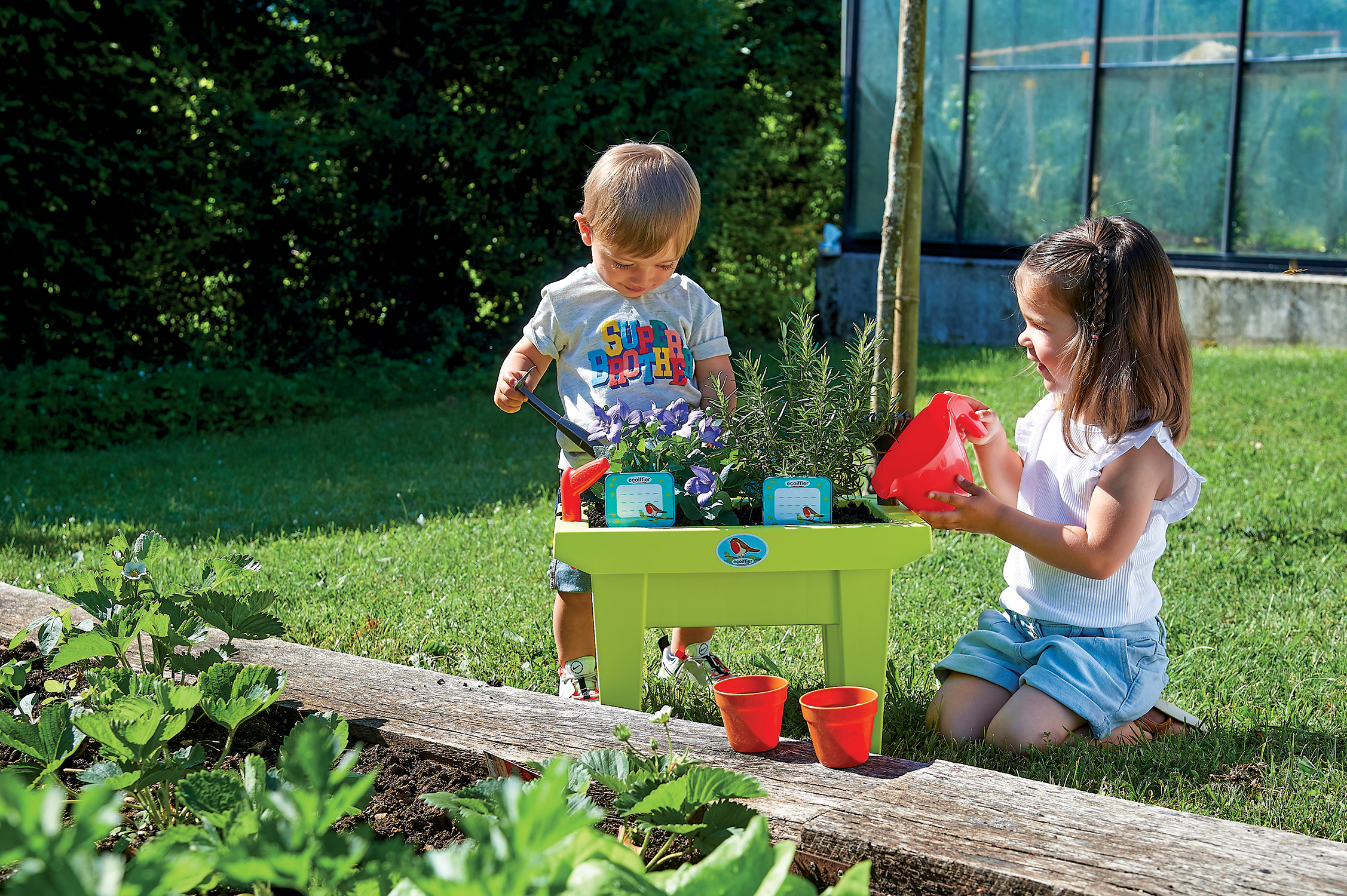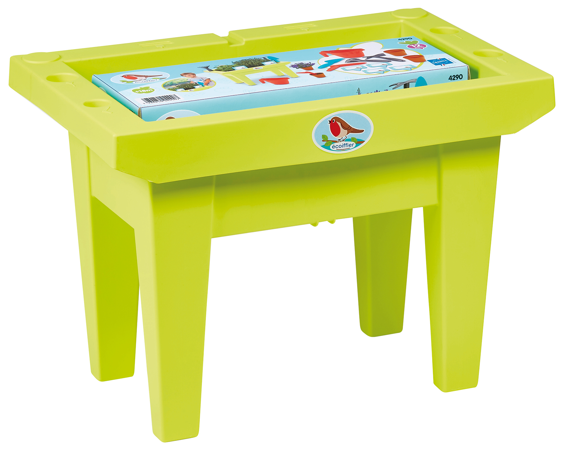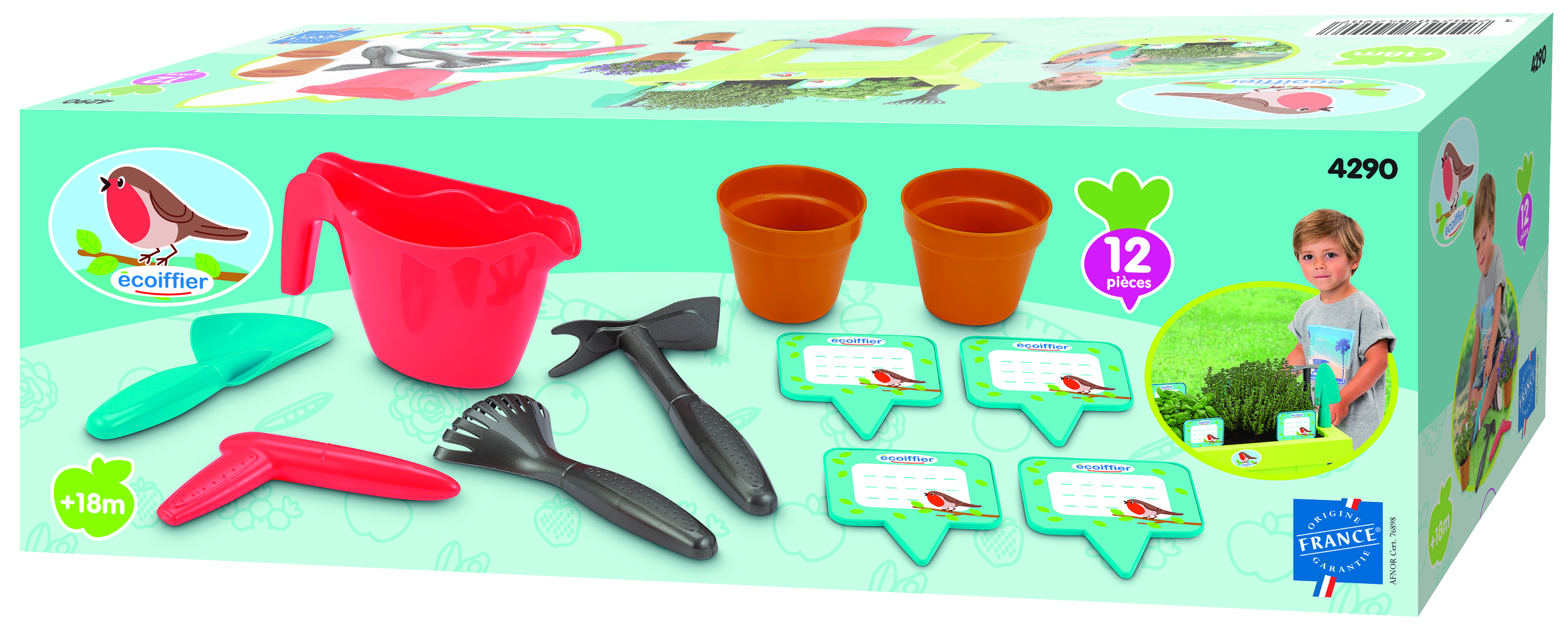 | La boîte contient | Cette jolie jardinière dont les dimensions sont L43cm X l24,5cm X H31cm permettra aux Jardiniers en herbe de faire pousser les plus belles plantes, fleurs… grâce aux 11 accessoires Inclus. Végétaux non fournis. Dès 18 mois. Origine France Garantie |