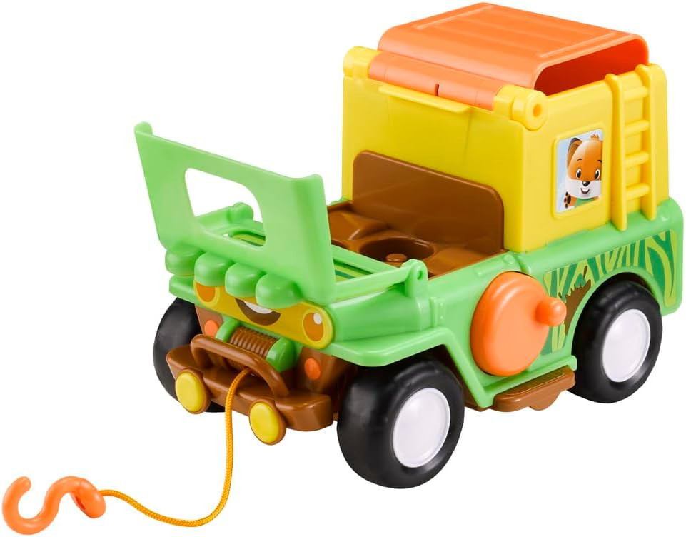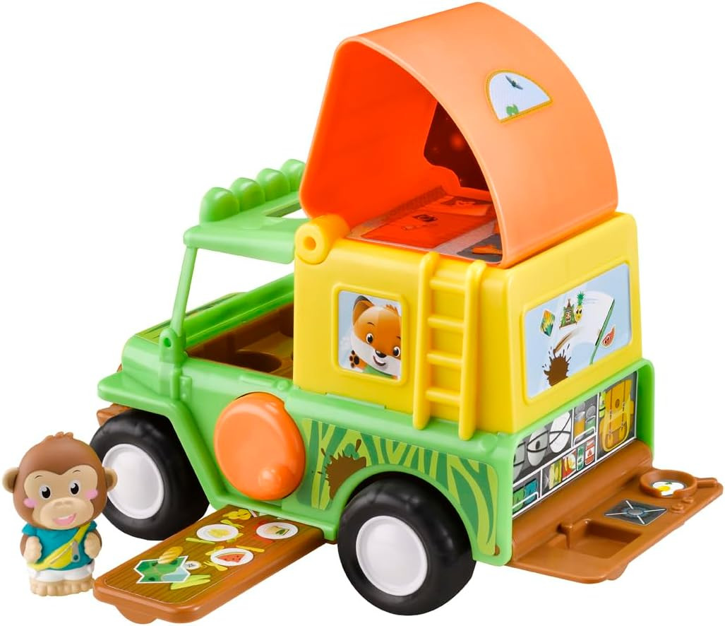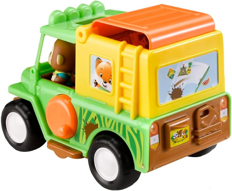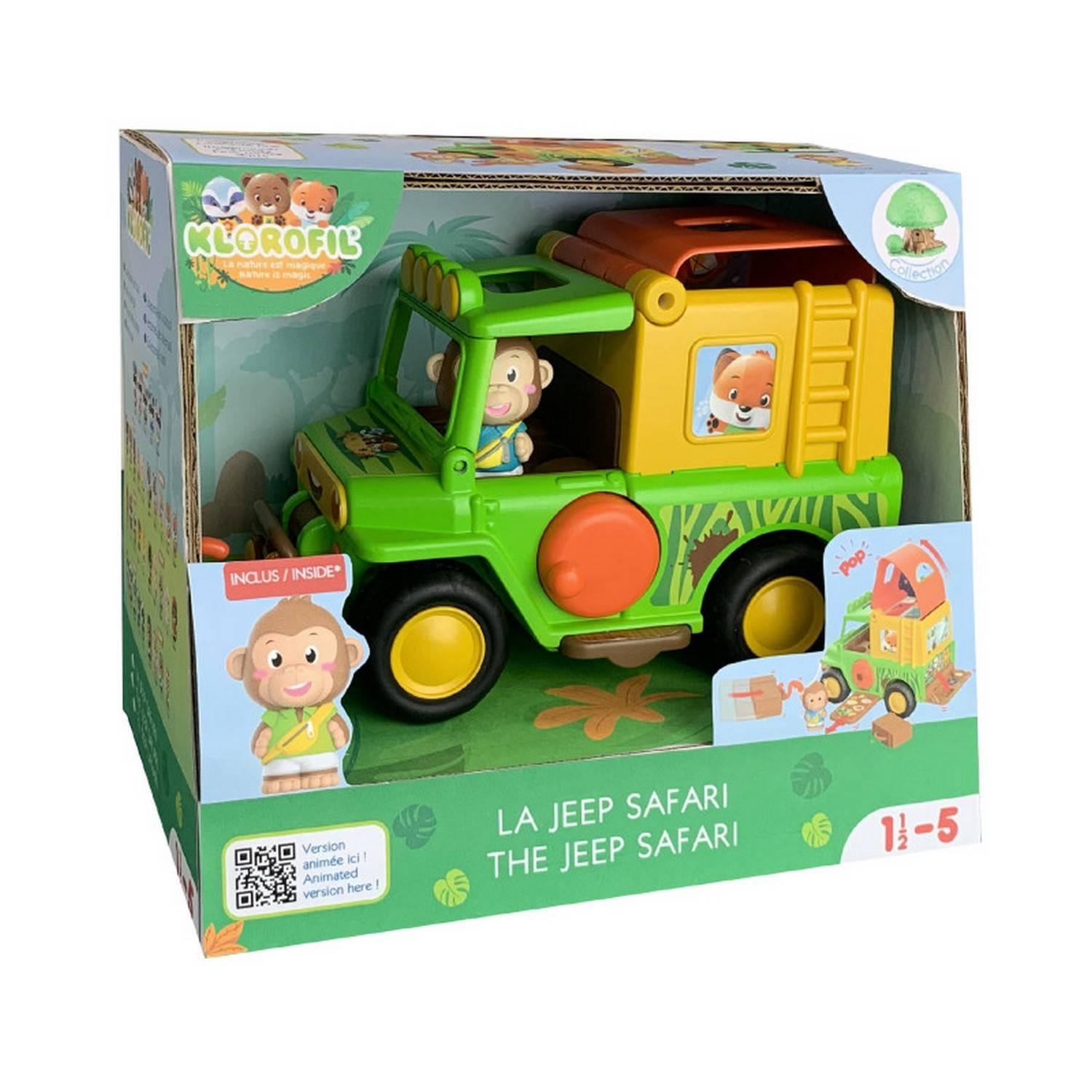 la jeep safari C’est parti pour l’aventure au cœur de la jungle, à bord du 4x4 des Klorofil ! Idéal pour installer un camp, le véhicule tout terrain est équipé d’une table qu’il suffit de faire coulisser. En ouvrant le coffre, on retrouve également toute une cuisine. Pop! Il suffit d’appuyer sur le toit et une chambre se déploie comme par magie! Pour se sortir de toutes situations, une manivelle actionne un treuil avec son crochet. Comprend une figurine exclusive : César le papa singe