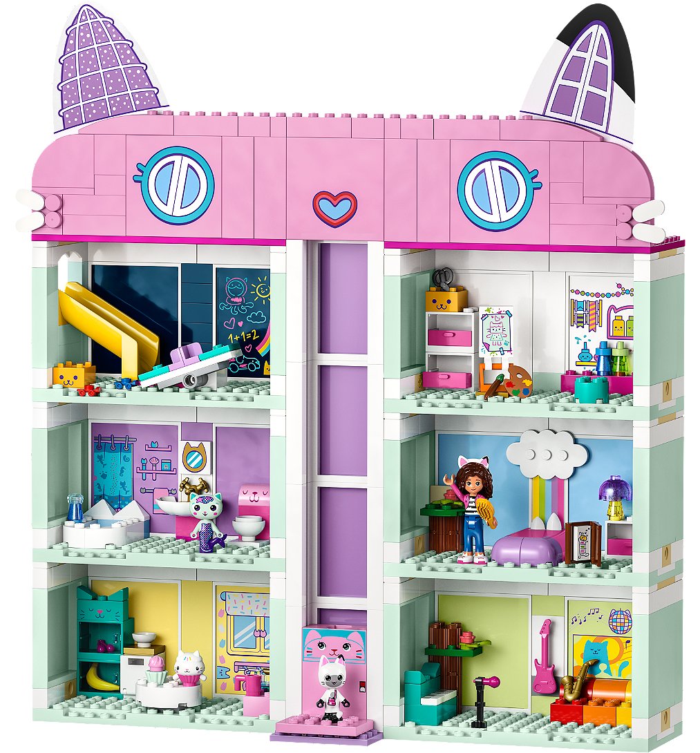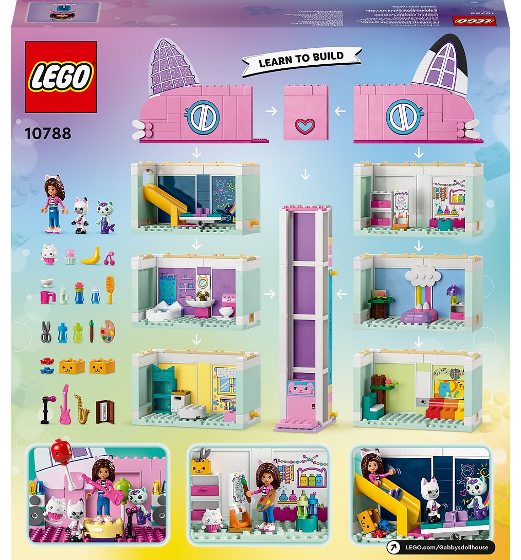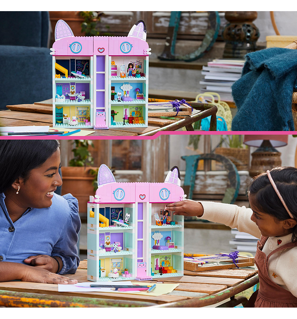 Le jouet Gabby et la Maison Magique comprend 8 pièces colorées reliées par un ascenseur coulissant, ainsi que de nombreux accessoires Gabby et la Maison Magique, notamment une banane, une baie, un cupcake, une tasse, un bol, des ciseaux, un pinceau et une palette, une brosse à cheveux, un livre, une fleur, un microphone, une guitare, un saxophone et bien d'autres choses encore. Les fans peuvent s'amuser à construire tous les détails authentiques de la maison de poupée de Gabby, puis décider dans quelle pièce jouer en premier. Par exemple, les enfants peuvent cuisiner dans la cuisine, utiliser un toboggan dans la salle de jeux, faire preuve de créativité dans la salle d'art, jouer du piano dans la salle de musique, se faire dorloter dans la salle de bains, faire une sieste dans la chambre ou se rendre sur le toit pour faire la fête sur la piste de danse rotative. Les enfants partagent leurs aventures avec quatre personnages populaires de la série Gabby et la Maison Magique : Gabby, Pandy, P’tichou et Marine. Il y a un guide de construction en histoire illustrée, et l'application LEGO Builder dispose d'outils intuitifs de zoom et de rotation. Une grande brique de démarrage garantit que le plaisir de la construction commence tout de suite.