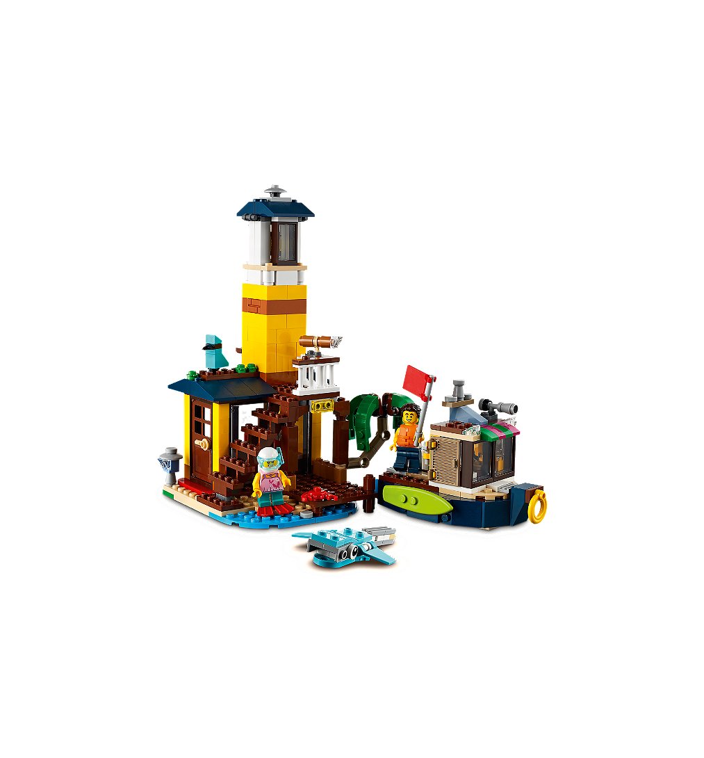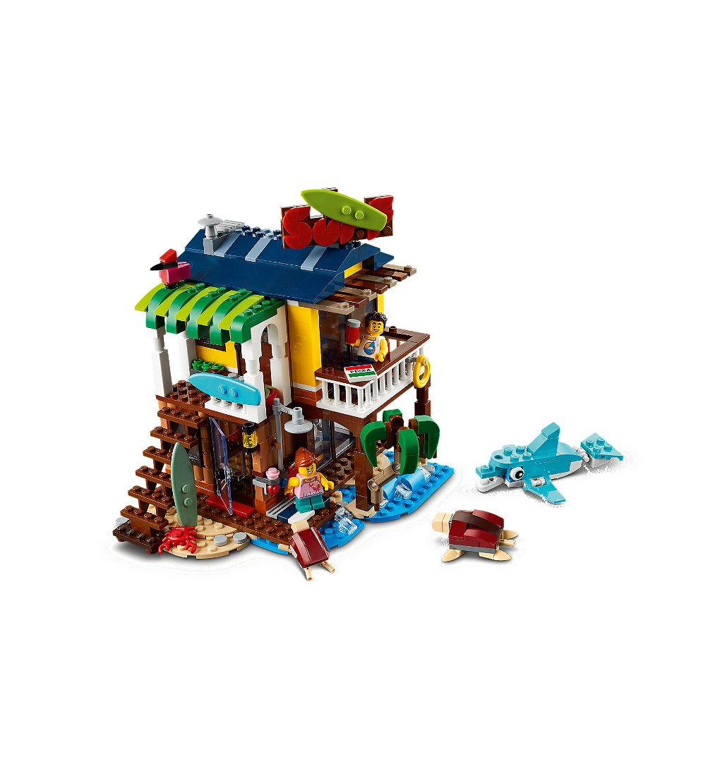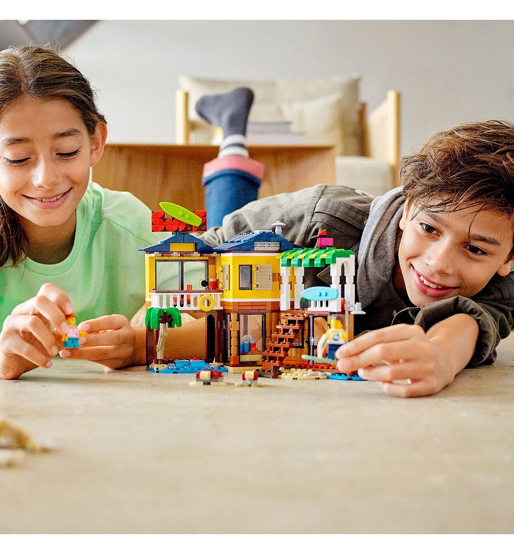 Plus produit Les enfants vont vivre des aventures débordantes daction à la plage avec le set LEGO® Creator 3-en-1 La maison sur la plage du surfeur, quils peuvent transformer en phare ou en cabane avec piscine.
