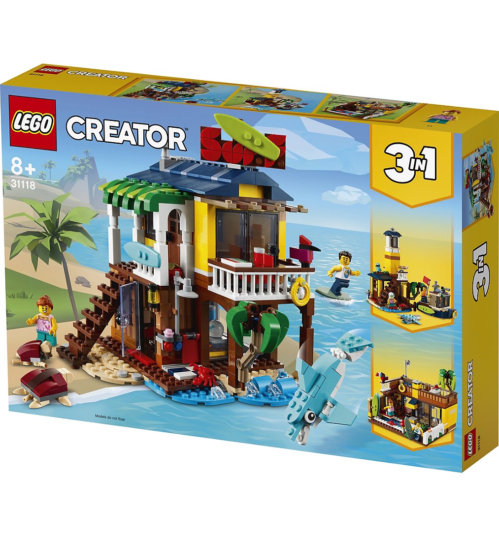 La boîte contient • Avec ses 3 modèles en 1 (une cabane de surfeur, un phare et une cabane avec piscine), le set LEGO® Creator 3-en-1 La maison sur la plage du surfeur (31118) promet des heures de divertissement aux enfants.• Ce set LEGO® comprend également les figurines d’un garçon et d’une fille que les enfants peuvent inclure dans leurs aventures à la plage.• La cabane de surfeur possède 2 étages avec des charnières pour l’ouvrir et jouer de différentes façons. Elle est livrée avec 3 animaux en briques : un dauphin, une tortue de mer et un bébé tortue.• Le phare contient un petit bateau et une raie manta, tandis que la cabane avec piscine comprend 2 étages, des planches de surf et une piscine en briques.• Ce set LEGO® Creator 3-en-1 de 564 pièces offre une expérience de construction enrichissante aux fans de LEGO de 8 ans et plus. Il constitue un formidable cadeau d’anniversaire ou de Noël.• La maison sur la plage LEGO® mesure plus de 19 cm de haut, 17 cm de large et 15 cm de profondeur, la taille idéale pour jouer ou pour être exposée dans une chambre.• D’autres sets LEGO® Creator 3-en-1 sont à découvrir dès janvier 2021 : Le cyber drone (31111), Le lion sauvage (31112), Le transporteur de voitures de course (31113) et La super moto (31114).• Avec les sets LEGO® Creator 3-en-1, les enfants laissent libre cours à leur imagination et inventent des histoires débordantes d’action avec les 3 modèles différents inclus dans chaque boîte.• Depuis plus de six décennies, les briques de construction LEGO® sont réalisées avec des matériaux de qualité supérieure pour s’assurer qu’elles s’assemblent et se séparent toujours facilement.• Les briques de construction LEGO® sont conformes aux normes de sécurité les plus rigoureuses au monde.