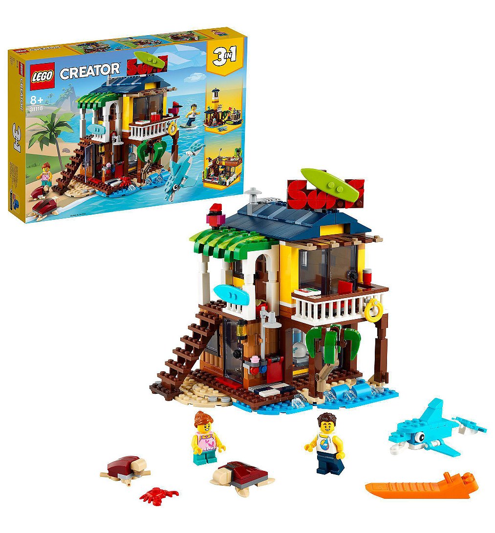 Les enfants vont adorer faire un voyage à la plage pour surfer et jouer avec des animaux marins avec ce brillant jeu de construction LEGO Creator 3-en-1 La Maison sur la Plage du Surfeur, (31118), avec 3 modèles différents et amusants. Les enfants de 8 ans et plus ont tout ce dont ils ont besoin pour créer des histoires passionnantes. Ce jouet de construction se transforme en cabane de plage à 2 étages avec des charnières pour se reconfigurer et s'ouvrir, 2 Minifigurines et 3 jouets animaux marins construits en briques - un dauphin, une tortue de mer et un bébé tortue de mer. Et après avoir assemblé la Maison sur la Plage du Surfeur, ils peuvent la reconstruire en phare, la transformer en cabane avec piscine ou utiliser les briques et les pièces pour créer quelque chose de nouveau. Les ensembles de construction LEGO Creator 3-en-1 permettent aux enfants de s'amuser de façon créative avec 3 modèles différents dans chaque ensemble ! Les options de jeu sont illimitées, car chacun des modèles peut être démonté et reconstruit en un nouvel objet aussi souvent que les enfants le souhaitent. Faites votre choix parmi une gamme de sets 3-en-1 étonnante qui comprend des animaux, des voitures et des cabanes safari qui sont de fantastiques cadeaux d'anniversaire ou de Noël pour les enfants de 8 ans et plus. La maison de plage LEGO mesure plus de 19 cm de haut, 17 cm de large et 15 cm de profondeur. Contient 564 pièces