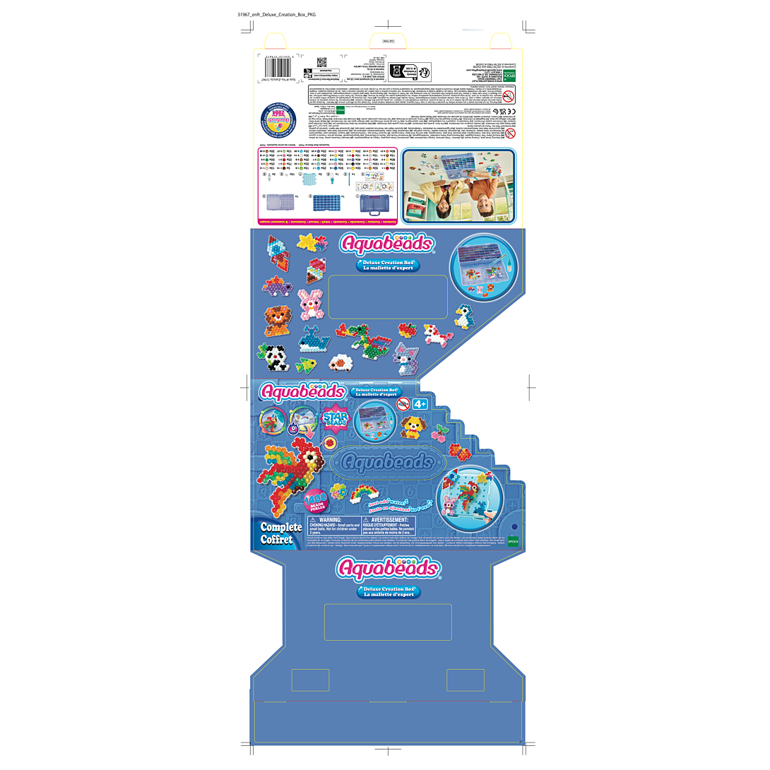 La mallette essentielle pour les experts d'Aquabeads ! Emmène ton coffret avec toi chez tes amis ou en vacances grâce au format mallette, et range le facilement dans ta chambre. Crée des lions, des perroquets ou des fusées avec ce coffret ultra complet! Le principe est simple : assemble les perles, vaporise de l'eau, laisse sécher et c'est prêt ! Avec 1400 perles de différentes formes (dont les perles étoiles) et couleurs, et tout ce qu'il faut pour des heures de créativité avec Aquabeads ! Dès 4 ans