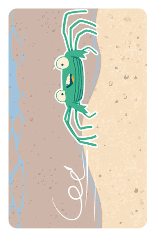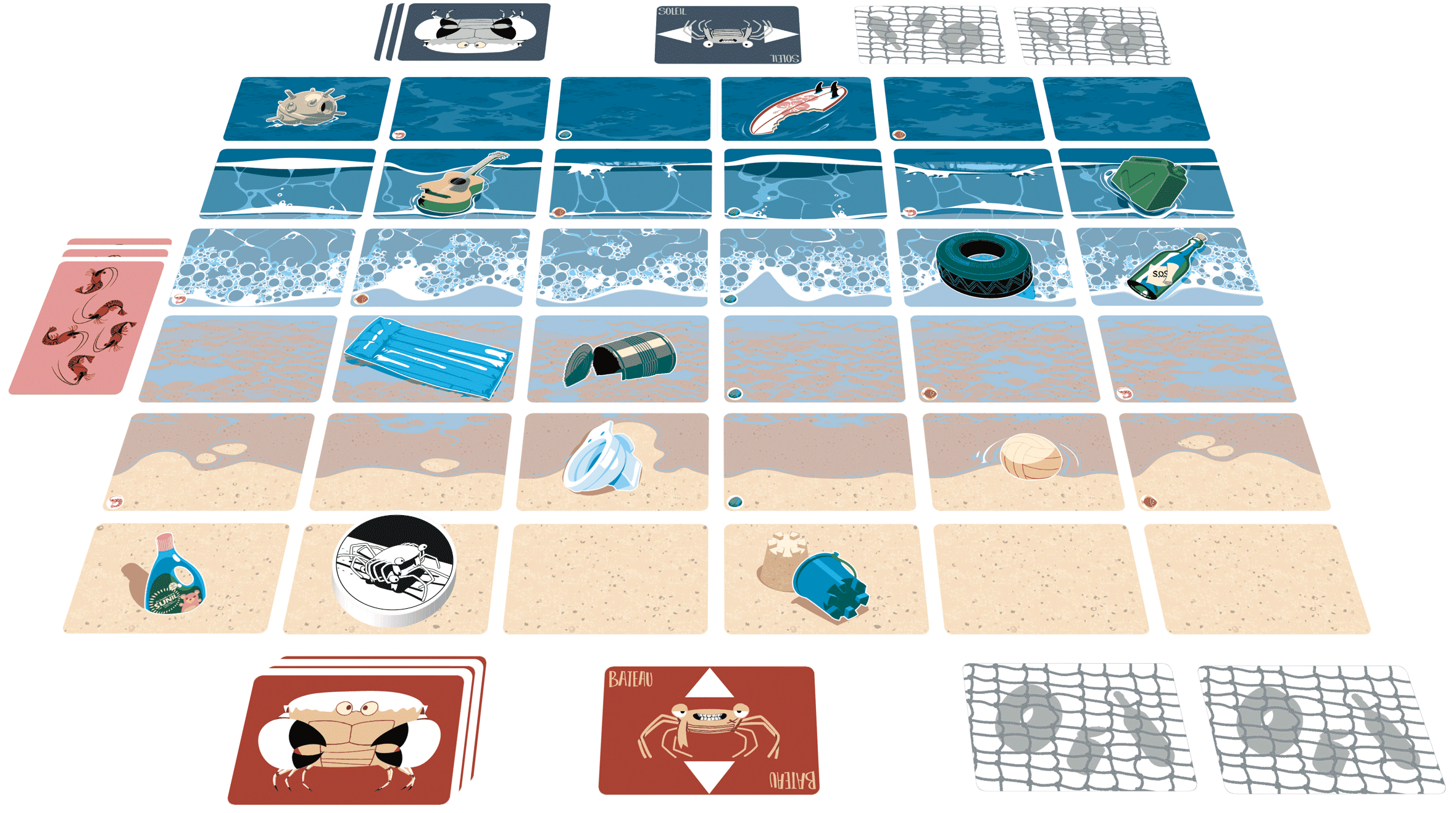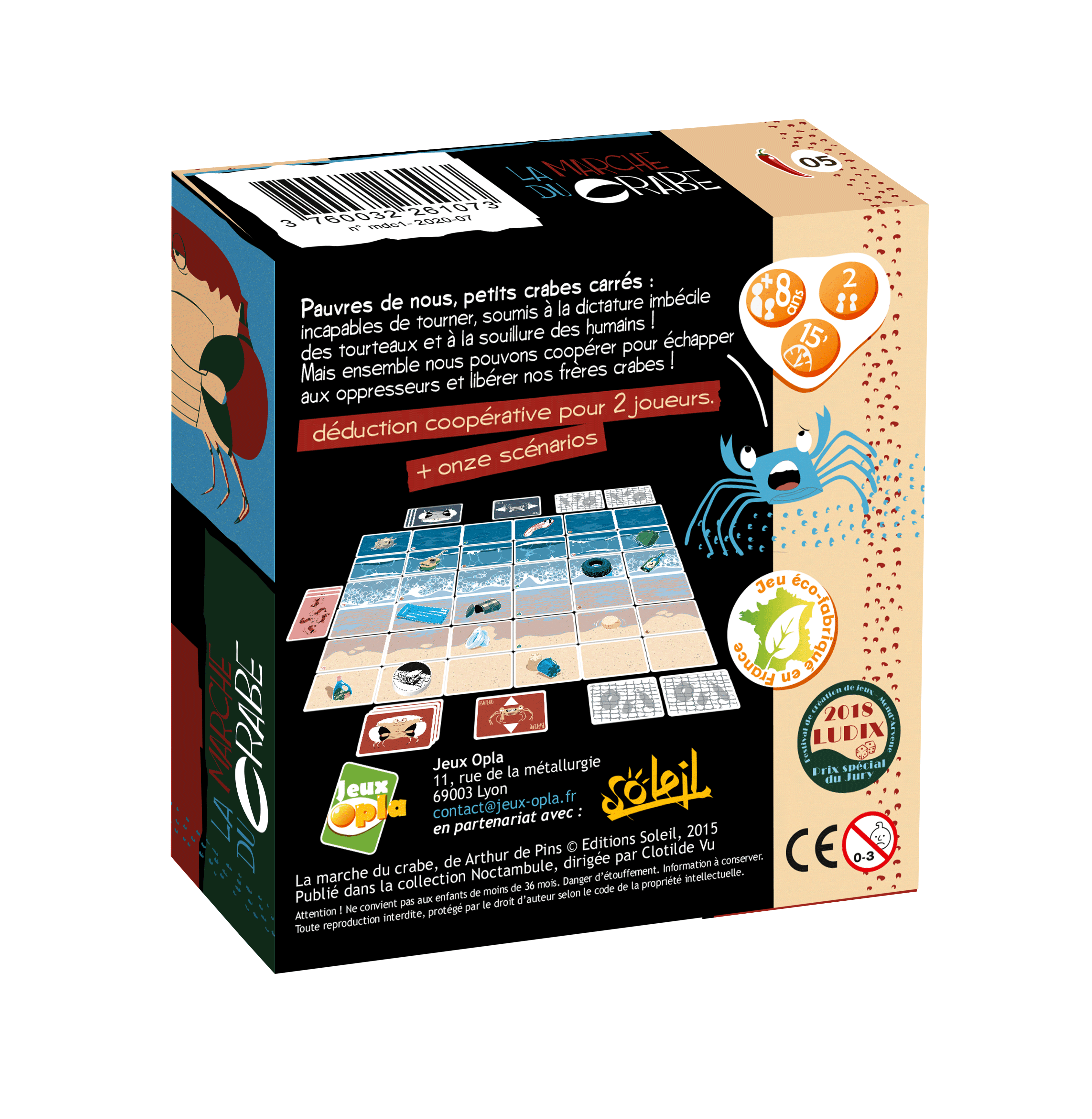 La Marche du Crabe est un jeu de déduction coopérative dans lequel les deux crabes joueurs dépendront complètement l’un de l’autre… Sans parler ! A votre tour de jeu, il suffit de placer une nouvelle carte « vilain » judicieusement en essayant de communiquer, par vos choix, des informations sur les zones dangereuses de la plage, puis, si vous le souhaitez, vous pouvez déplacer le duo de crabe. Un joueur ne se déplace que verticalement sur la plage et l’autre uniquement horizontalement. Un jeu évolutif ! Au début il s’agit juste de sauver les autres crabes en évitant les tourteaux, puis, éviter les homards, les phobies sur certains objets, les raies qui aident ou pas, les cailloux … Et le tout avec une réserve de crevettes de sauvegarde limitée.