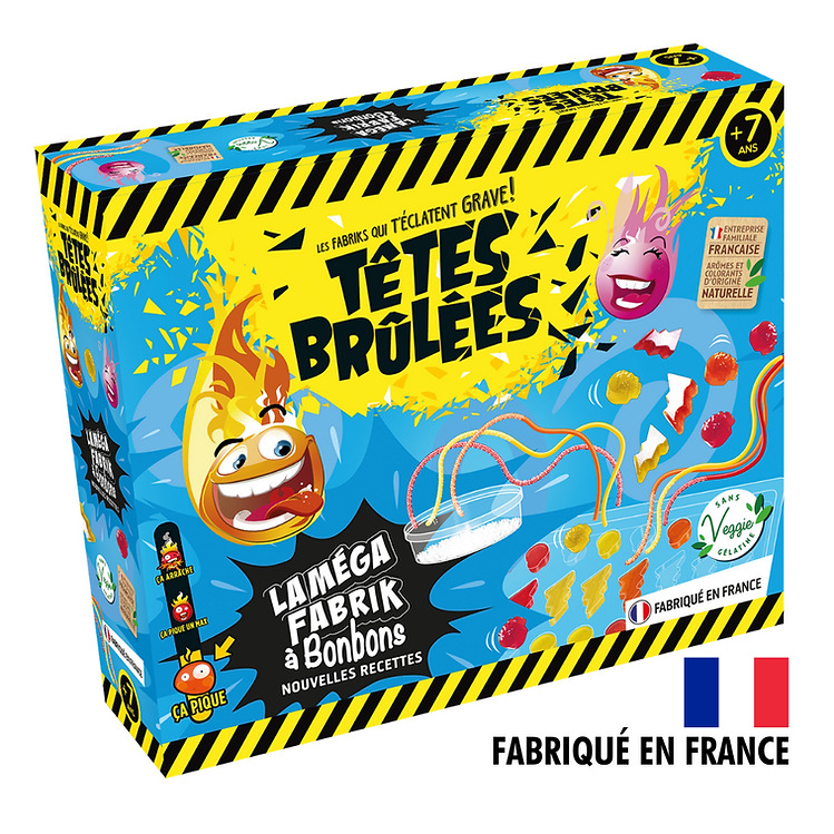 Avec la Méga Fabrik à bonbons Têtes Brûlées, vos enfants vont se transformer en maîtres confiseurs. Véritable laboratoire du goût et de l’acide, la Fabrik à bonbons fournit le nécessaire pour qu’ils inventent leurs propres Têtes Brulées gélifiés, en moule ou en fil, aux saveurs de leurs choix. Ils expérimentent, combinent les ingrédients et découvrent le plaisir de la cuisine maison. A base d’arômes naturels, ce mini-laboratoire permet aux enfants de produire environ 750 grammes de bonbons avec un point commun : il faut que ça piiiiiique ! Un jouet Fabriqué en France. Arômes et colorants 100% naturels. Gélifiant végétal. Le coffret ULTIME pour fabriquer tous les types de bonbons Têtes Brûlées : fils, gélifiés.... Matériel : 2 boîtes hermétiques avec couvercle de 250 ml 1 boîte transparente avec couvercle à vis de 135 ml 1 boîte transparente avec couvercle à vis de 40 ml 1 bêcher gradué de 50 à 250 ml avec bec verseurs 1 cuillère doseuse en plastique de 25 ml 1 mini cuillère doseuse de 1.5 ml 1 pince Ingrédients : Nouilles de riz issus de l’agriculture biologique, 6 sachets de mélange sucre glace et arôme naturels (orange, pêche, fraise et cola), 6 sachets de mélange sucre glace et colorant naturels (jaune, rouge, orange et marron),1 sachets de 15 gr d’acide citrique, 1 sachet de 100gr d'un mélange acide citrique + sucre