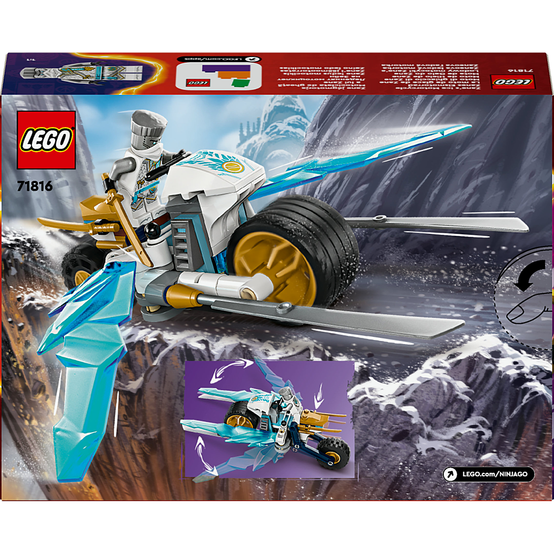 La moto de glace de Zane LEGO NINJAGO (71816) invite les garçons et les filles dès 7 ans à recréer l’action trépidante de la saison 2 de la série télévisée NINJAGO Le soulèvement des dragons. Ce jouet ninja pour enfants comprend une moto NINJAGO avec des roues mobiles, des lames dorées et une suspension sur le pneu arrière. Lorsque les enfants appuient sur le pneu, des lames de glace se déploient des deux côtés. Ce jouet impressionnant inclut une minifigurine LEGO NINJAGO de Zane à placer sur la moto. Zane est vêtu de son armure de tournoi (une exclusivité de ce set) et est équipé de 2 katanas, pour des heures de jeu dans l’univers NINJAGO, ce set constitue également un superbe objet décoratif à exposer dans une chambre. La gamme de sets de construction et d’action LEGO NINJAGO inclut des robots, des dragons et des temples qui encouragent les enfants à inventer une foule d’histoires avec leurs héros pour un jeu de rôle interactif et amusant. L’appli LEGO Builder vous permet de vivre une aventure de construction simple et intuitive avec votre enfant,