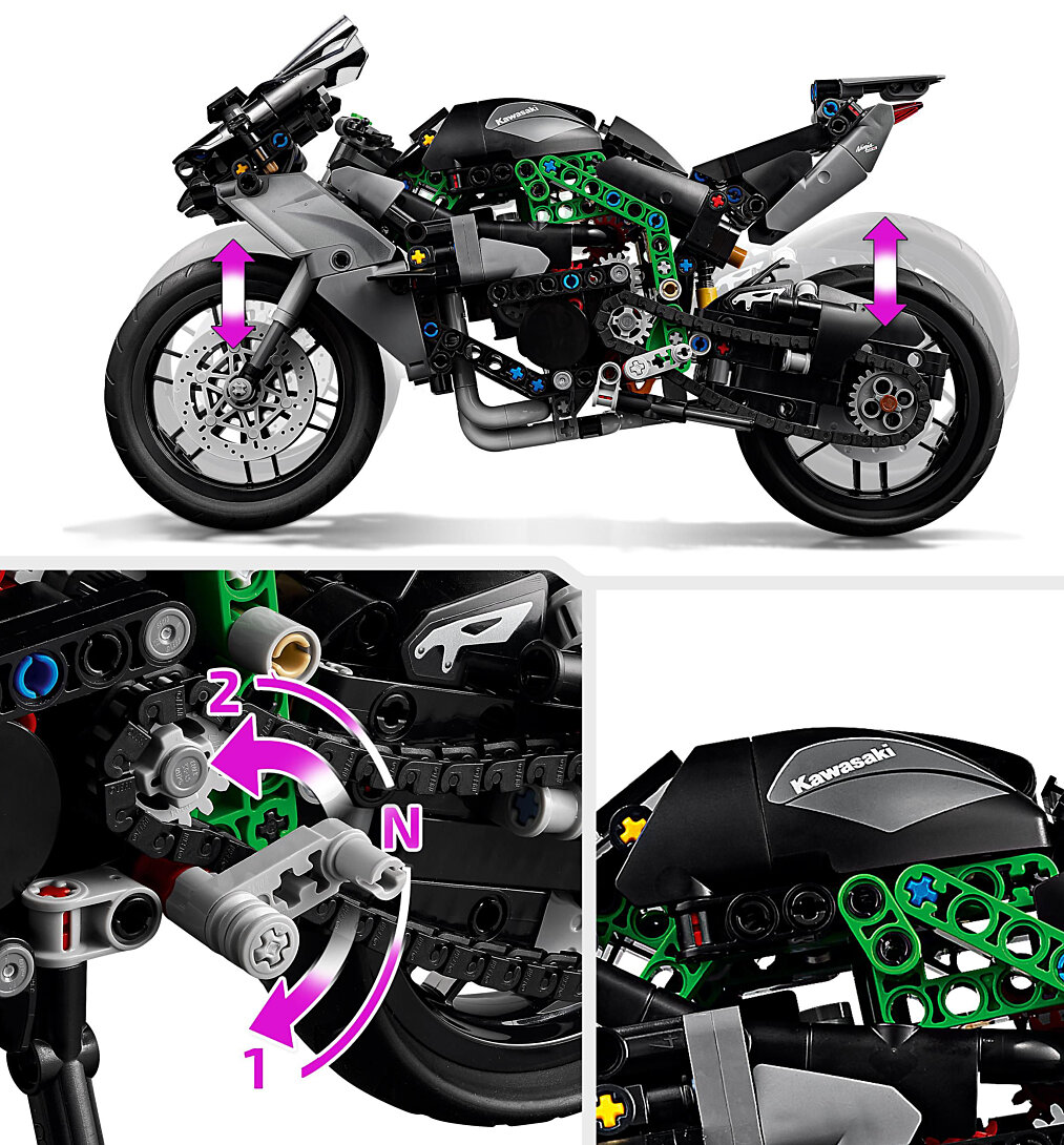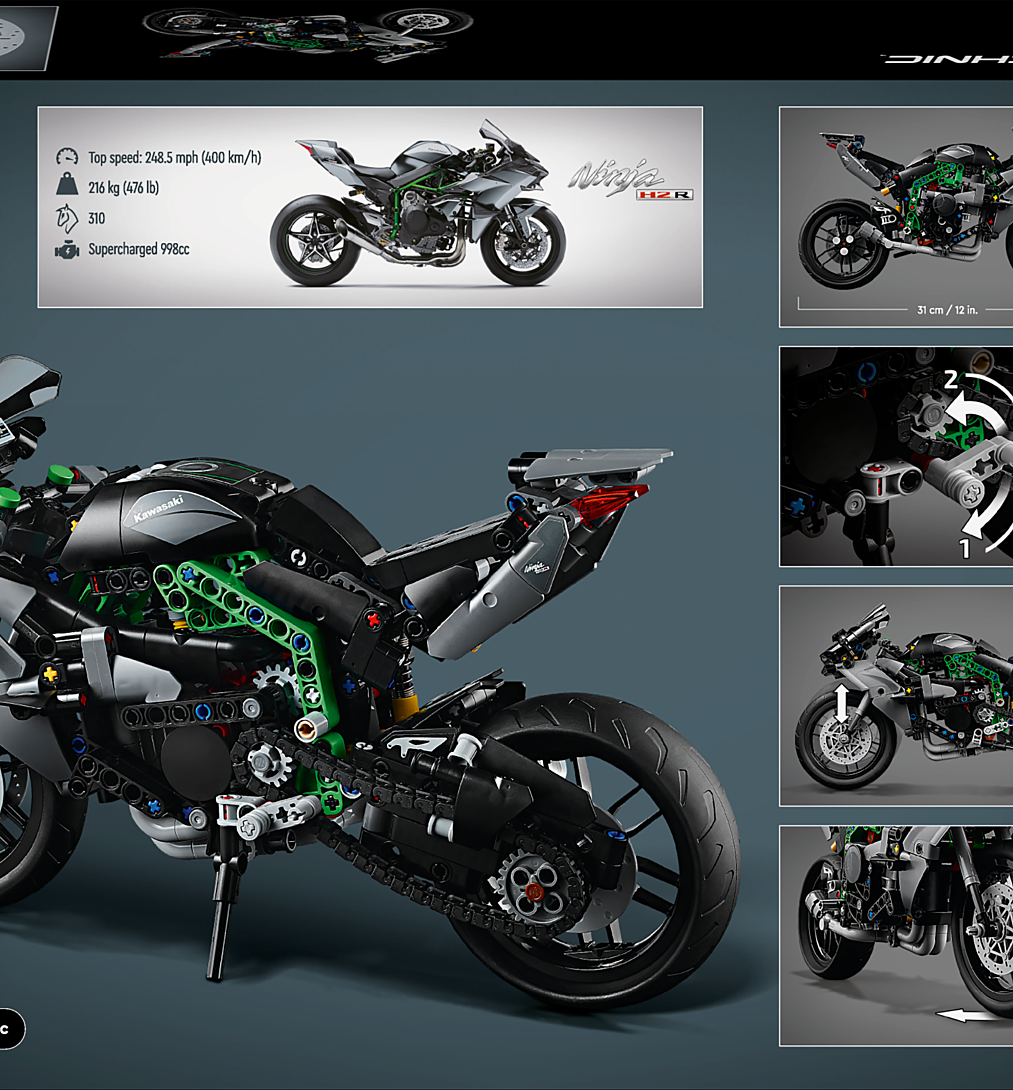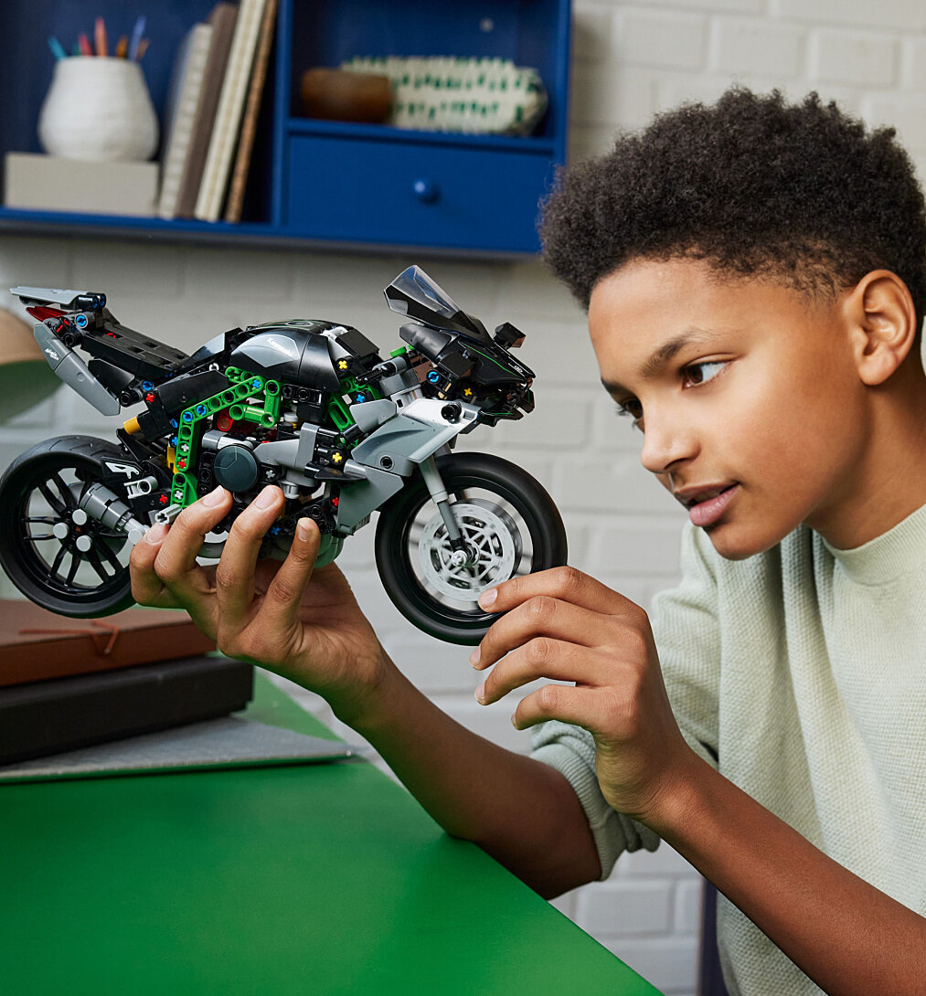Initiez des enfants dès 10 ans à l’ingénierie et à la technologie avec La moto Kawasaki Ninja H2R LEGO® Technic (42170). Ce set pour les garçons et les filles recrée fidèlement les détails de l’une des motos de série les plus rapides au monde : la Kawasaki Ninja H2R. Cette moto à l’échelle 1:8 pour enfants inclut une direction, une suspension, une boîte à 2 vitesses, un moteur 4 cylindres articulé et un turbocompresseur. Le pare-brise s’orne d’une décoration personnalisée et le logo Kawasaki est apposé sur les deux côtés du réservoir de carburant. Les enfants peuvent s’amuser à recréer les détails de la moto puis tester ses différentes fonctions avant de l’exposer sur sa béquille. Les sets LEGO Technic présentent des détails réalistes qui font découvrir aux jeunes constructeurs LEGO le monde de l’ingénierie. Les enfants vivent une aventure créative encore plus captivante avec l’application LEGO Builder, qui leur permet de zoomer, de faire pivoter les modèles en 3D et de suivre leur progression.