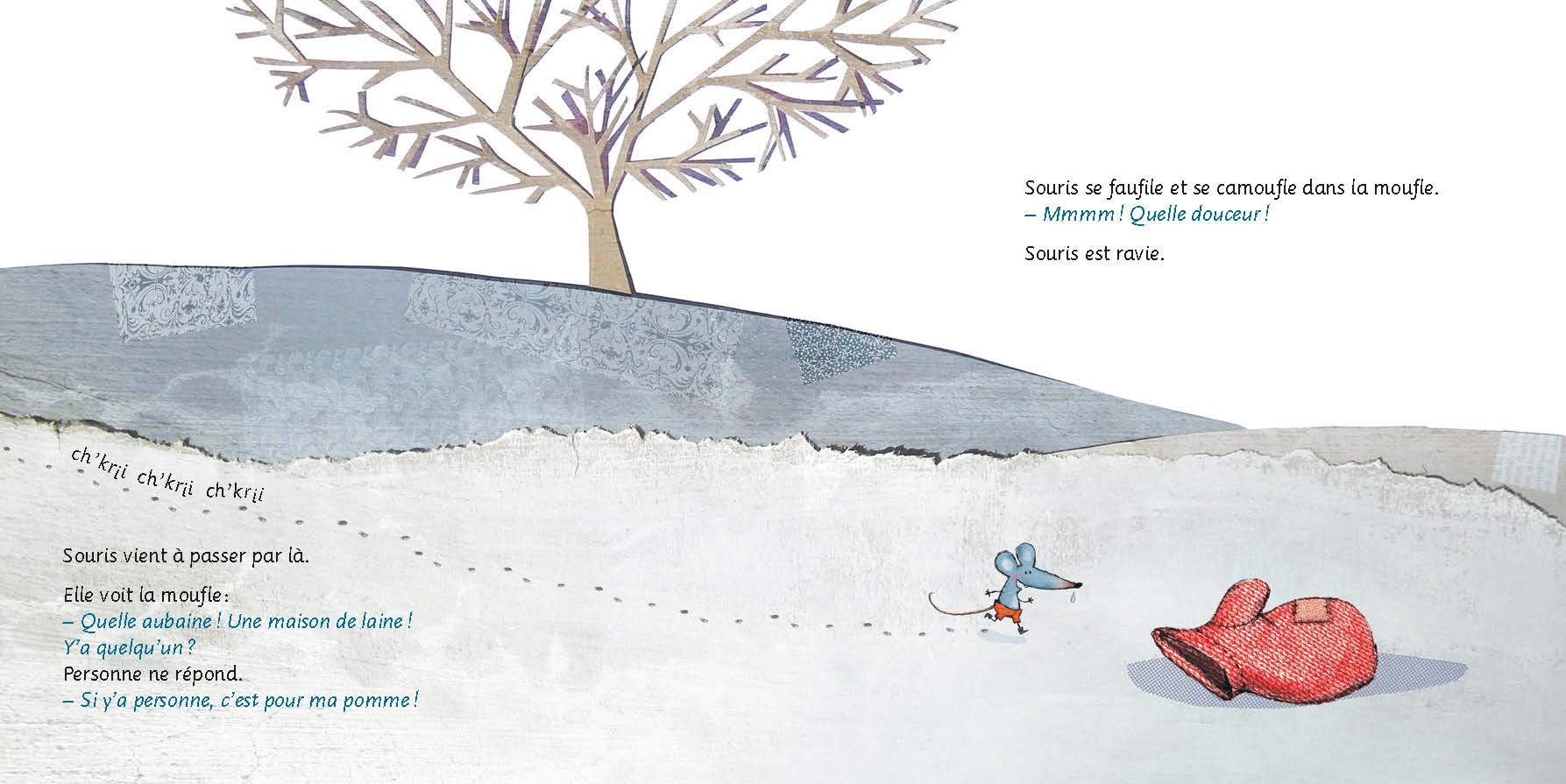Par une journée de grand froid, Souris se promène et trouve une moufle en laine rouge sur la neige. Toute contente, elle se blottit à l’intérieur. Puis arrivent Lièvre, Renard, Sanglier et enfin Ours Potelé qui voudraient bien, eux aussi, profiter de l’aubaine !