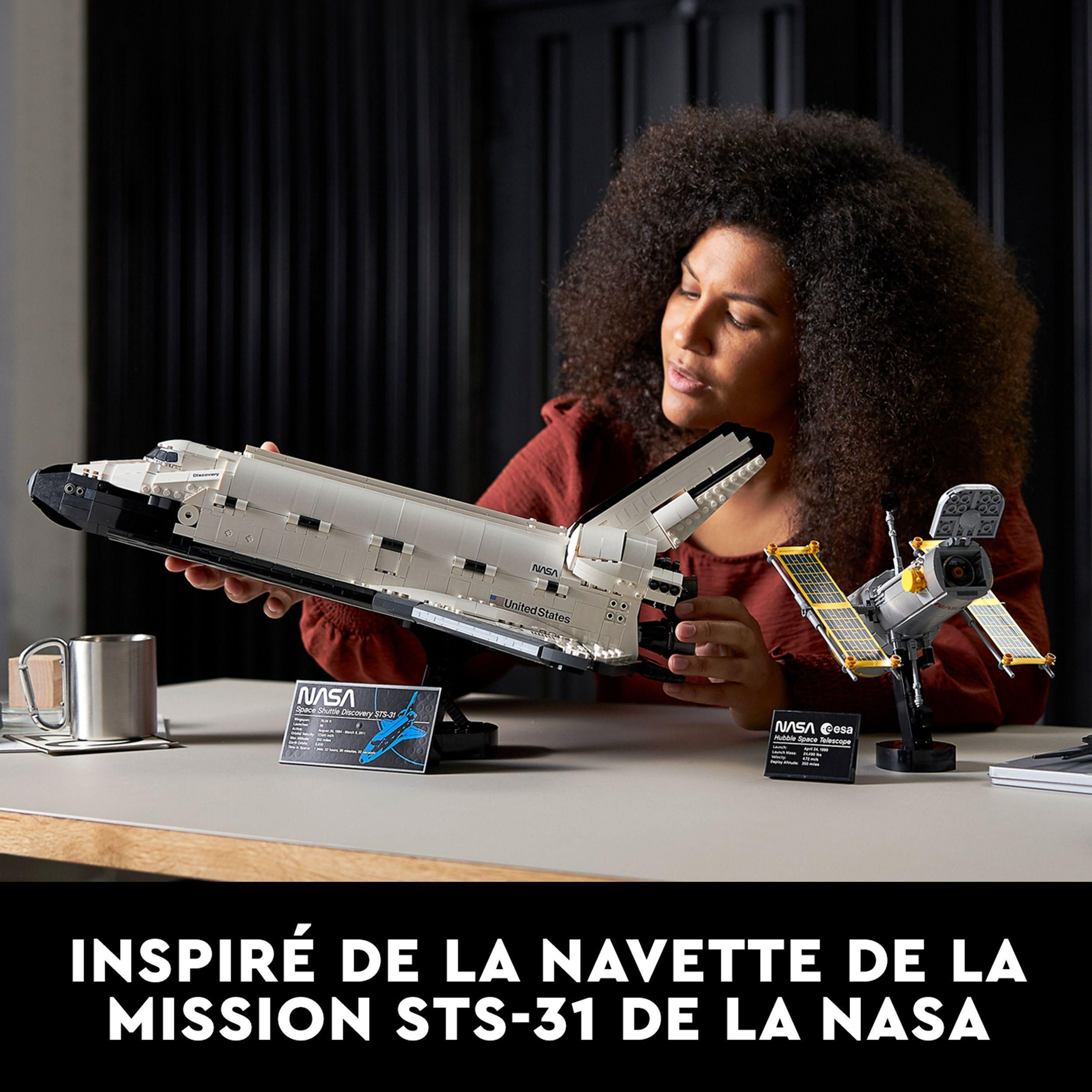 Cap vers l’espace avec le set LEGO® La navette spatiale Discovery de la NASA (10283). Ce défi passionnant et exigeant de 2 354 pièces vous permet de construire la navette Discovery et le télescope Hubble, lancé en 1990 lors de la mission STS-31 de la NASA.Dans la peau d’un astronauteCe projet détaillé célèbre les exploits fascinants de Discovery. Ouvrez la soute pour déployer le télescope Hubble en mission d’exploration dans le cosmos. Ajustez les élevons, sortez le train d’atterrissage et déployez le bras robot. Le cockpit s’ouvre pour révéler l’habitacle et le poste de pilotage avec des sièges pour les 5 membres d’équipage. Le télescope est équipé de panneaux solaires orientables et d’une trappe. La navette spatiale et le télescope peuvent être exposés ensemble ou séparément.Un projet pour vousLa navette spatiale Discovery de la NASA LEGO (10283) fait partie d’une série de sets invitant les adultes à s’évader du quotidien en construisant de superbes modèles d’exposition.